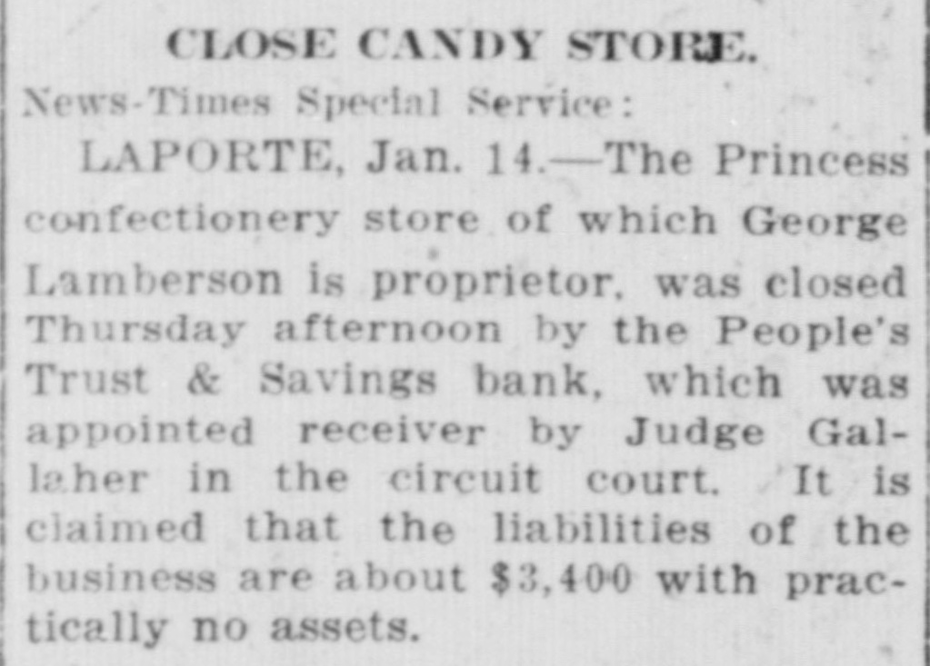 CLOSE CANDY STORE. News-Times Special Service: LAPORTE, Jan. 14.-The Princess confectionery store of which George Lamberson is proprietor, was closed Thursday afternoon by the People's Trust & Savings bank, which was appointed receiver by Judge Gallaher in the circuit court. It is claimed that the liabilities of the business are about $3,400 with practically no assets.