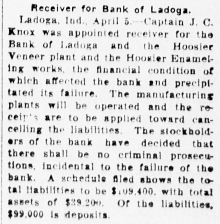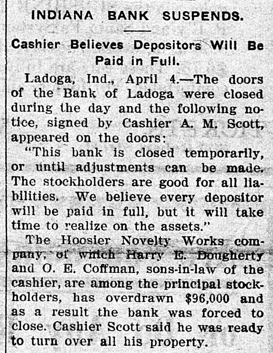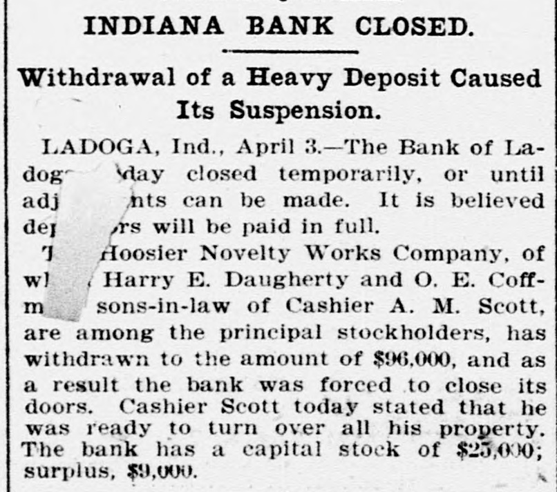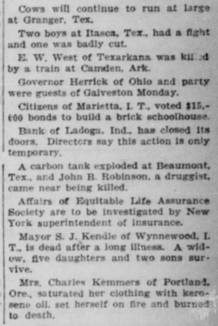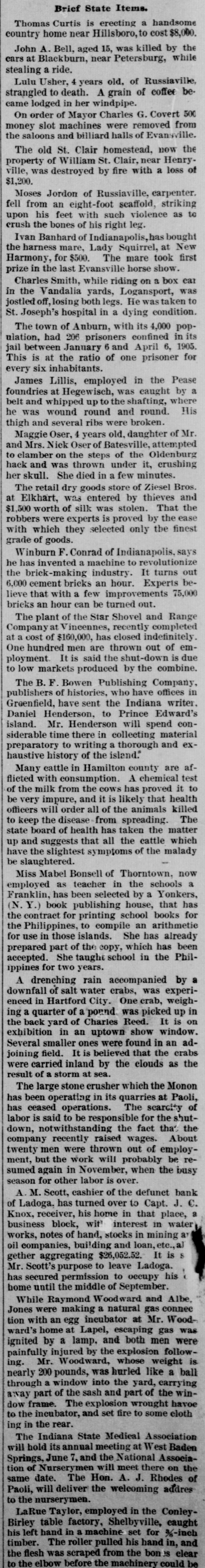 Brief State Items. Thomas Curtis is erecting a handsome country home near Hillsboro, to cost $8,000. John A. Bell, aged 15, was killed by the cars at Blackburn, near Petersburg, while stealing a ride. Lulu Usher, 4 years old. of Russiaville, strangled to death. A grain of coffee became lodged in her windpipe. On order of Mayor Charles G. Covert 500 money slot machines were removed from the saloons and billiard halls of Evansville. The old St. Clair homestead, now the property of William St. Clair, near Henryville, was destroyed by fire with a loss of $1,200. Moses Jordon of Russiaville, carpenter. fell from an eight-foot scaffold, striking upon his feet with such violence as to crush the bones of his right leg. Ivan Banhard of Indianapolis, bought the harness mare, Lady Squirrel, at New Harmony, for $500. The mare took first prize in the last Evansville horse show. Charles Smith, while riding on a box car in the Vandalia yards, Logansport, was jostled losing both legs. He was taken to St. Joseph's hospital in a dying condition. The town of Auburn, with its 4,000 population, had 206 prisoners confined in its jail between January 6 and April 6, 1905. This is at the ratio of one prisoner for every six inhabitants. James Lillis, employed in the Pease foundries at Hegewisch, was eaught by a belt and whipped up to the shafting, where he was wound round and round. His thigh and several ribs were broken. Maggie Oser, 4 years old, daughter of Mr. and Mrs. Nick Oser of Batesville, attempted to clamber on the steps of the Oldenburg hack and was thrown under it, crushing her skull. She died in a few minutes. The retail dry goods store of Ziesel Bros. at Elkhart, was entered by thieves and $1,500 worth of silk was stolen. That the robbers were experts is proved by the ease with which they selected only the finest grade of goods. Winburn F. Conrad of Indianapolis, says he has invented a machine to revolutionize the brick-making industry. It turns out 6.000 cement bricks an hour. Experts believe that with a few improvements 75,000 bricks an hour can be turned out. The plant of the Star Shovel and Range Company at Vincennes, recently completed at a cost of $160,000, has closed indefinitely. One hundred men are thrown out of employment. It is said the shut-down is due to low markets produced by the combine. The B. F Bowen Publishing Company, publishers of histories, who have offices in Greenfield, have sent the Indiana writer. Daniel Henderson, to Prince Edward's island. Mr. Henderson will spend considerable time there in collecting material preparatory to writing a thorough and exhaustive history of the island." Many cattle in Hamilton county are afflicted with consumption. A chemical test of the milk from the cows has proved it to be very impure, and it is likely that health officers will order all of the animals killed to keep the disease from spreading. The state board of health has taken the matter up and suggests that all the cattle which have the slightest symptoms of the malady be slaughtered. Miss Mabel Bonsell of Thorntown, now employed as teacher in the schools a Franklin, has been selected by a Yonkers, (N. Y.) book publishing house, that has the contract for printing school books for the Philippines, to compile an arithmetic for use in those islands. She has already prepared part of the copy, which has been accepted. She taught school in the Philippines for two years. A drenching rain accompanied by a downfall of salt water crabs, was experienced in Hartford City. One crab, weighing a quarter of a pound was picked up in the back yard of Charles Reed. It is on exhibition in an uptown show window. Several smaller ones were found in an adjoining field. It is believed that the crabs were carried inland by the clouds as the result of a storm at sea. The large stone crusher which the Monon has been operating in its quarries at Paoli, has ceased operations. The scarcity of labor is said to be responsible for the shutdown, notwithstanding the fact that the company recently raised wages. About twenty men were thrown out of employment, but the work will probably be resumed again in November, when the busy season for other labor is over. A M. Scott, cashier of the defunct bank of Ladoga. has turned over to Capt. J. C. Knox, receiver, his home in that place, a business block, wit interest in water works, notes of hand, stocks in mining a oil companies, building and loan, S gether aggregating $26,052.52. It is Mr. Scott's purpose to leave Ladoga. has secured permission to occupy his home until the middle of September. While Raymond Woodward and Albe, Jones were making a natural gas connec tion with an egg ineubator at Mr. Woodward's home at Lapel, escaping gas was ignited by a lamp. and both men were painfully injured by the explosion following. Mr. Woodward, whose weight is nearly 200 pounds, was hurled like a ball through a window into the yard, carrying away part of the sash and part of the window frame. The explosion wrought havoe to the incubator, and set fire to some cloth ing in the rear. The Indiana State Medical Association will hold its annual meeting at West Baden Springs, June 7, and the National Association of Nurserymen will meet there on the same date. The Hon. A. J. Rhodes of Paoli, will deliver the welcoming addres to the nurserymen. LaRue Taylor, employed in the ConleyBirley table factory, Shelbyville, caught