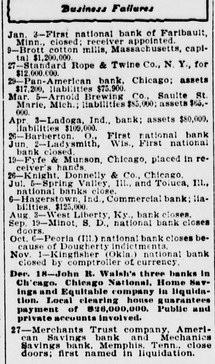 Business Failures Jan. 3-First national bank of Faribault, Minn., closed; receiver appointed. 9-Brott cotton mills, Massachusetts, capital $1,200,000. 27-Standard Rope & Twine Co., N. Y., for $12,000,000. 29-Pan-American bank, Chicago; assets $17,200, liabilities $75,900. Mar. 5-Arnold Brewing Co., Saulte St. Marie, Mich.; liabilities $85,000; assets $65,000. 7-Coe Co., Minneapolis; liabilities, $200,000. Apr. 3-Ladoga, Ind., bank; assets $80,000, liabilities $109,000. 24-Canton, O., state bank closes Lexington, Okla., First national bank fails. 26-Barberton O., First national bank Jun. 2-Ladysmith, Wis., First national bank closed. 19-Fyfe & Munson, Chicago, placed in receiver's hands. 23-Vicksburg, M h., exchange bank. 26-Knight, Donnelly & Co., Chicago. 28-Terre Haute, Ind., national bank closed doors. Jul. 5-Spring Valley, Ill., and Toluca, Ill., national banks close. 6-Hagerstown, Ind., Commercial bank; liabilities, $125,000. 19-Spring Valley, O., bank closes. 20-City national bank. Kansas City, Mo. Aug. 3-West Liberty, Ky., bank closes. 21-Western bank, Louisville, Ky.; due to overloans. Sep. 19-Minot, S. D., national bank closes doors. Oct. 6-Peoria (III.) national bank closes because of Dougherty indictments. Nov. 1-Kingfisher (Okla.) national bank closed by comptroller of currency. Dec. 18-John R. Walsh's three banks in Chicago. Chicago National, Home Savings and Equitable company in liquidation. Local clearing house guarantees payment of $26,000,000. Public and private accounts involved. 27-Merchants Trust company, American Savings bank and Mechanics Savings bank, Memphis, Tenn., close doors; first named in liquidation.