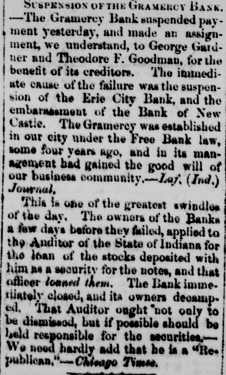 # SUSPENSION OF THE GRAMERCY BANK. -The Gramercy Bank suspended payment yesterday, and made an assignment, we understand, to George Gardner and Theodore F. Goodman, for the benefit of its creditors. The immediate cause of the failure was the suspension of the Erie City Bank, and the embarrassment of the Bank of New Castle. The Gramercy was established in our city under the Free Bank law, some four years ago, and in its management had gained the good will of our business community.-Laf. (Ind.) Journal. This is one of the greatest swindles of the day. The owners of the Banks a few days before they failed, applied to the Auditor of the State of Indiana for the loan of the stocks deposited with him as a security for the notes, and that officer loaned them. The Bank immediately closed, and its owners decamped. That Auditor ought not only to be dismissed, but if possible should be held responsible for the securities,-We need hardly add that he is a "Republican,"-Chicago Times.