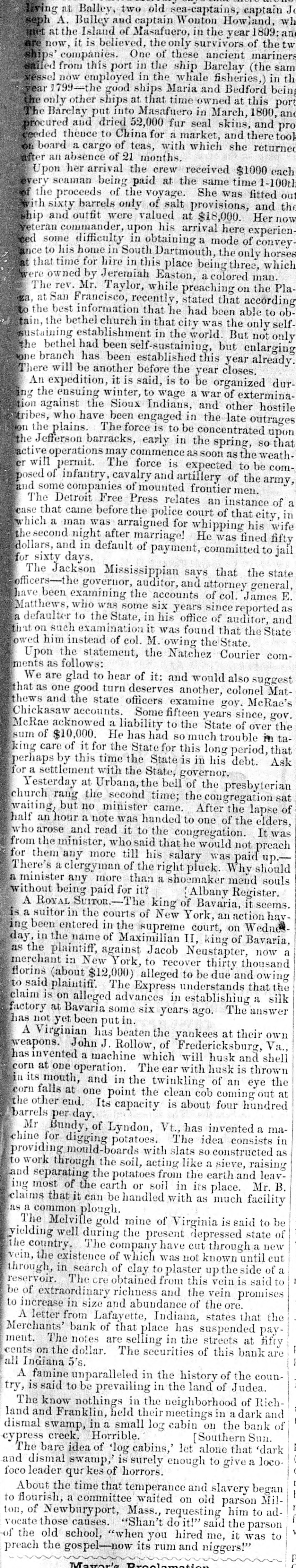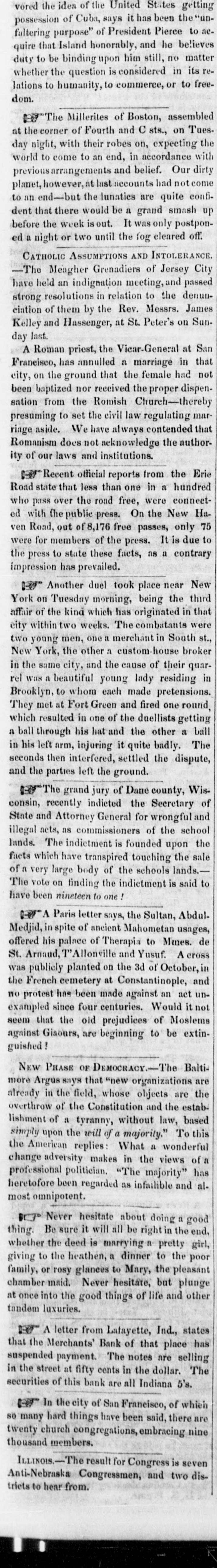 From which it will be seen that the increase in receipts now amounts to 34,000 bales; the decrease in exports to Great Britain, 1,00; other foreign ports, 5,000; increase to France, 23,000. Total increase in exports, 17,000 bales. The Clearing House Exchanges were large to-day, $21,078,458. There was rather a more cheerful feeling in the Money market to-day, but the change was not very marked. The rates are as before noticed. Mr. Patchin, as we stated yesterday, has paid the money into Court for the Coupons of the 1st Mortgage Bonds of the Buffalo and New-York City Railroad, as the interest is advertised to be paid either at the Pratt Bank, Buffalo, or the Bank of Commerce, New-York. The latter institution will not be ready for & few days to pay coupons. We learn from Layfayette, Ind., that the Merchants' Bank of that place has suspended payment. The notes are selling in the street at 50 cents the dollar. The securities of this bank are all Indiana 58. The tolls collected in New-York City on the canals from commencement of navigation to Nov. 1, 1854, $301,461 35 are 40,380 38 Increase over last year The Penobscot Railroad advertised for sale at auction by A. C. Flagg, trustee, has been withdrawn. It is stated that the outstanding bonds have been retired, and the mortgage is to be discharged. The old contract for the construction of the road has been canceled, and payment in full made to the contractors. Mr. J. C. Tracy has been appointed Cashier of the Farmers' and Mechanics' Bank of Hartford, vice Geo. P. Bissell, resigned. A private banking establishment has been started in Hartford, Conn, under the style of George P. Bissell & Co., by D. F. Robinson, late President of the Hartford Bank; Calvin Day, of the firm of Day, Owen & Co., Hartford; and George P. Bissell, late Cashier of the Farmers' and Mechanics' Bank, Hartford. Among the references of this house are J. J. Palmer, President of the Merchants' Bank, and Duncan, Sherman & Co. The total net earned premiums of the Sun Mutual Office, for the year ending the 4th inst., were $1,916,753 03. The losses, expenses, reïnsurance, &c., for the same time, amounted to $1,881,927 67, leaving a profit of $34,825 36. The profits of the Company to the 4th of October, 1853, were $2,861,756, for which certificates have been paid off, including 36 P cent. of 1851, to the amount of $1,888,696. The assets of the Company, less its indebtedness, are $1,456,325 36. The Trustees announce that, notwithstanding the great marine insurance losses of the present year, the reserved fund of one million dollars remains unimpaired. Deeming it expedient to increase its capital, bereafter only one-half the profits of the Company will be appropriated to the redemption of the scrip until the accumulation shall reach at least two million dollars. The Trustees have declared & dividend interest to the let. inst. of 3 v cent. on the outstanding scrip of the Company, payable in cash on and after the 31st day of December next. The Louisville Courier states that the liabilities of G. H. Monsaratt & Co, of that city, who lately made an assignment, are about $80,000, while their available assets are estimated at $131,000. The failare of the house was precipitated, if not produced, by the fact of a confidential agent or carrier having defaulted with a large amount of funds, intrusted to him for transportation from Paducah to Louisville, for the benefit of the house. The amounts at the several depositories to the credit of the Treasurer of the United States on the 23d of October, were as follows: