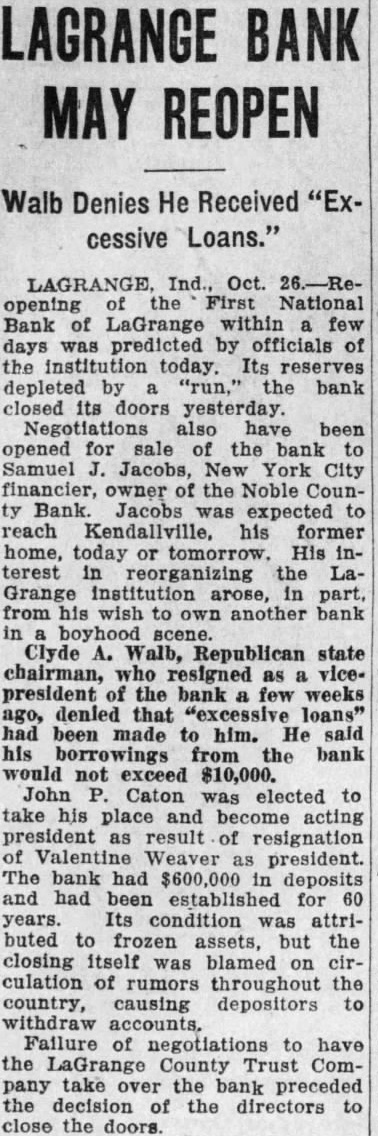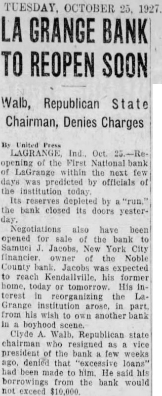 Another dividend was paid by the Comptroller of currency creditors of the First National Bank of LaGrange. last week making total of sixty cent. paid to date. with more follow