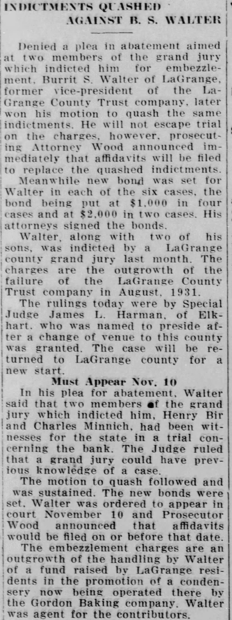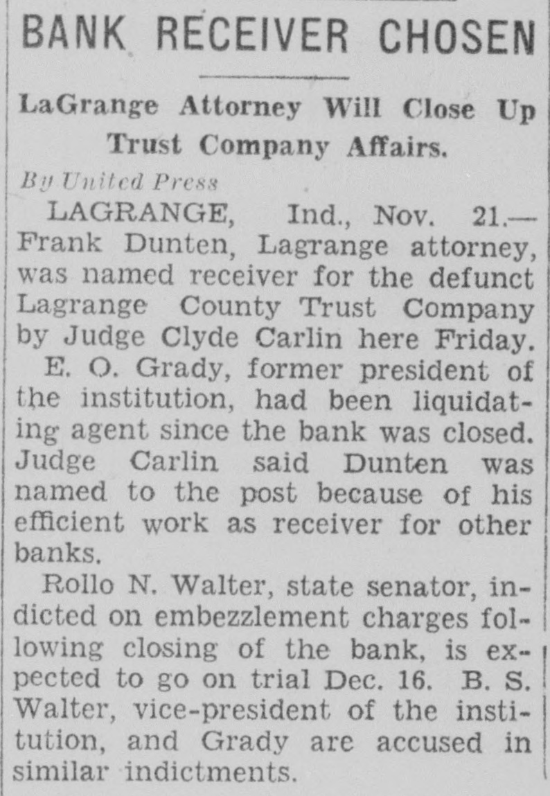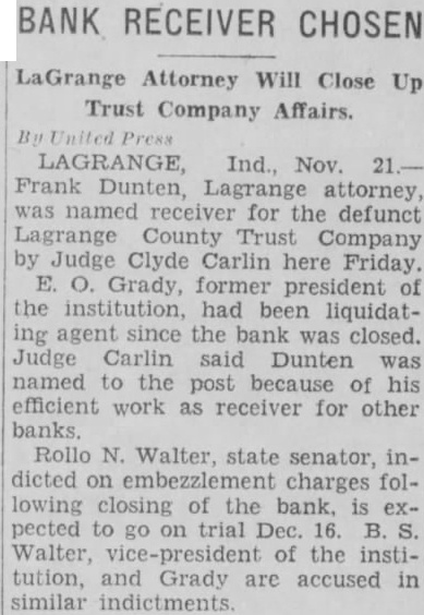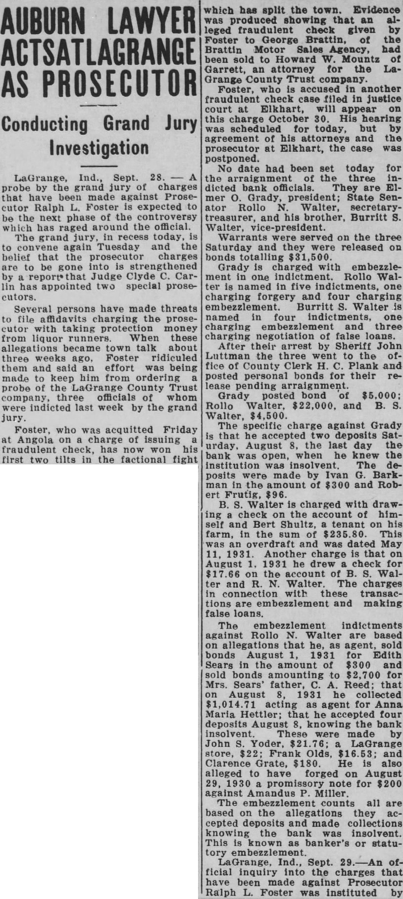 AUBURN LAWYER ACTSATLAGRANGE Grand Jury Conducting Investigation LaGrange, Ind., Sept. probe by the grand jury of charges that been made against Prosecutor Ralph Foster expected to be the next phase of the controversy has raged the official. The grand jury, in recess today, Tuesday and the belief that the prosecutor charges to be gone into is strengthened by Judge Clyde Carlin has appointed two special prosecutors. Several persons have made threats to file affidavits charging the prosecutor with taking money from liquor runners. When these allegations became town talk about three weeks ago, Foster ridiculed them and said an effort was being made to keep him from ordering probe of the LaGrange County Trust company, three of whom were indicted last week by the grand jury. Foster, who was acquitted Friday Angola on charge of issuing fraudulent check, has now won his first two tilts in the factional fight which has split the town. Evidence produced showing that an leged fraudulent check given by Foster George Brattin, the Brattin Motor Sales Agency, had been sold to Howard W. Mountz of Garrett, an attorney for the LaGrange County Trust company Foster, who accused in another fraudulent check case filed in justice court at Elkhart, will appear this charge October 30. His hearing scheduled for today, but by agreement of his attorneys and the prosecutor at Elkhart, the case was postponed. No date had been set today for the of the three dicted bank officials. They are E1mer Grady, president; State Senator Rollo Walter, secretarytreasurer, and his brother, Burritt Walter, vice-president. Warrants were served on the three Saturday and they were released on bonds Grady is charged with embezzlement in one indictment. Rollo Walter is named in five one charging forgery and four charging embezzlement. Burritt Walter is named in four one charging and three charging negotiation of false loans. After their arrest by John Luttman the three went to the office of County Clerk H. Plank and posted personal bonds for their release Grady bond of $5,000; Rollo Walter, $22,000, and Walter, $4,500. The specific charge against Grady that he accepted deposits Saturday, August the last day the bank was open, when he knew the institution was insolvent. The deposits were made by Ivan Barkman in the amount of $300 and RobFrutig, $96. B. Walter is charged with drawing check on the account of himand Bert Shultz, tenant his farm, in the sum of This overdraft and was dated May 1931. Another charge is that on 1931 he drew check for on the account of Walter and Walter. The charges connection with these transactions are and making false loans. The embezzlement indictments against Rollo Walter are based allegations that he, as agent, sold bonds August 1931 for Edith Sears in the amount of $300 and sold bonds amounting to $2,700 for Mrs. Sears' father, Reed: that August 1931 he collected acting as agent for Anna Maria Hettler; that he accepted four deposits August 8, knowing the bank insolvent. These were made by John Yoder, LaGrange store, $22: Frank Olds, and Clarence Grate, $180. He also alleged to have forged on August 1930 promissory note for $200 against Amandus Miller. The embezzlement counts all are based on the allegations they accepted deposits and made collections knowing the bank was insolvent. This is known as banker's or statutory LaGrange, Ind., Sept. official inquiry into the charges that have been made against Prosecutor Ralph Foster was instituted by