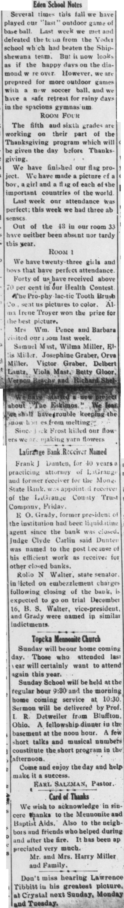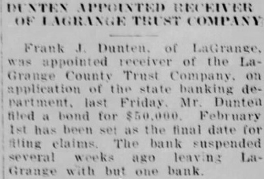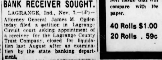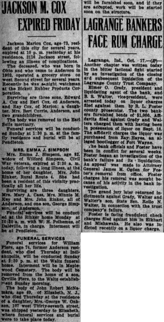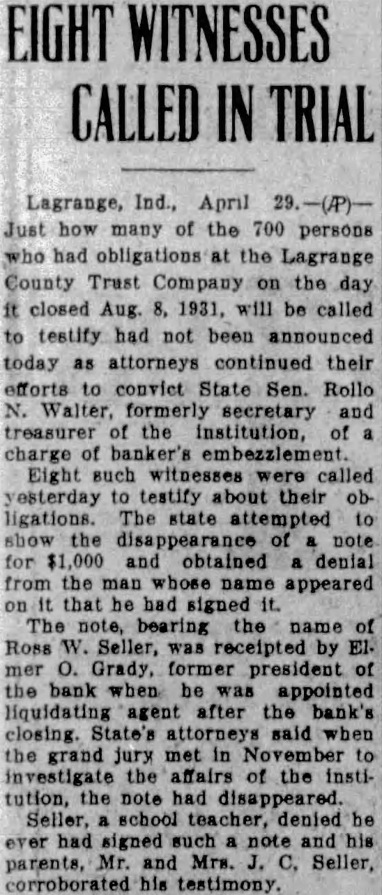 AUBURN LAWYER ACTSATLAGRANGE Grand Jury Conducting Investigation LaGrange, Ind., Sept. probe by the grand jury of charges that been made against Prosecutor Ralph Foster expected to be the next phase of the controversy has raged the official. The grand jury, in recess today, Tuesday and the belief that the prosecutor charges to be gone into is strengthened by Judge Clyde Carlin has appointed two special prosecutors. Several persons have made threats to file affidavits charging the prosecutor with taking money from liquor runners. When these allegations became town talk about three weeks ago, Foster ridiculed them and said an effort was being made to keep him from ordering probe of the LaGrange County Trust company, three of whom were indicted last week by the grand jury. Foster, who was acquitted Friday Angola on charge of issuing fraudulent check, has now won his first two tilts in the factional fight which has split the town. Evidence produced showing that an leged fraudulent check given by Foster George Brattin, the Brattin Motor Sales Agency, had been sold to Howard W. Mountz of Garrett, an attorney for the LaGrange County Trust company Foster, who accused in another fraudulent check case filed in justice court at Elkhart, will appear this charge October 30. His hearing scheduled for today, but by agreement of his attorneys and the prosecutor at Elkhart, the case was postponed. No date had been set today for the of the three dicted bank officials. They are E1mer Grady, president; State Senator Rollo Walter, secretarytreasurer, and his brother, Burritt Walter, vice-president. Warrants were served on the three Saturday and they were released on bonds Grady is charged with embezzlement in one indictment. Rollo Walter is named in five one charging forgery and four charging embezzlement. Burritt Walter is named in four one charging and three charging negotiation of false loans. After their arrest by John Luttman the three went to the office of County Clerk H. Plank and posted personal bonds for their release Grady bond of $5,000; Rollo Walter, $22,000, and Walter, $4,500. The specific charge against Grady that he accepted deposits Saturday, August the last day the bank was open, when he knew the institution was insolvent. The deposits were made by Ivan Barkman in the amount of $300 and RobFrutig, $96. B. Walter is charged with drawing check on the account of himand Bert Shultz, tenant his farm, in the sum of This overdraft and was dated May 1931. Another charge is that on 1931 he drew check for on the account of Walter and Walter. The charges connection with these transactions are and making false loans. The embezzlement indictments against Rollo Walter are based allegations that he, as agent, sold bonds August 1931 for Edith Sears in the amount of $300 and sold bonds amounting to $2,700 for Mrs. Sears' father, Reed: that August 1931 he collected acting as agent for Anna Maria Hettler; that he accepted four deposits August 8, knowing the bank insolvent. These were made by John Yoder, LaGrange store, $22: Frank Olds, and Clarence Grate, $180. He also alleged to have forged on August 1930 promissory note for $200 against Amandus Miller. The embezzlement counts all are based on the allegations they accepted deposits and made collections knowing the bank was insolvent. This is known as banker's or statutory LaGrange, Ind., Sept. official inquiry into the charges that have been made against Prosecutor Ralph Foster was instituted by