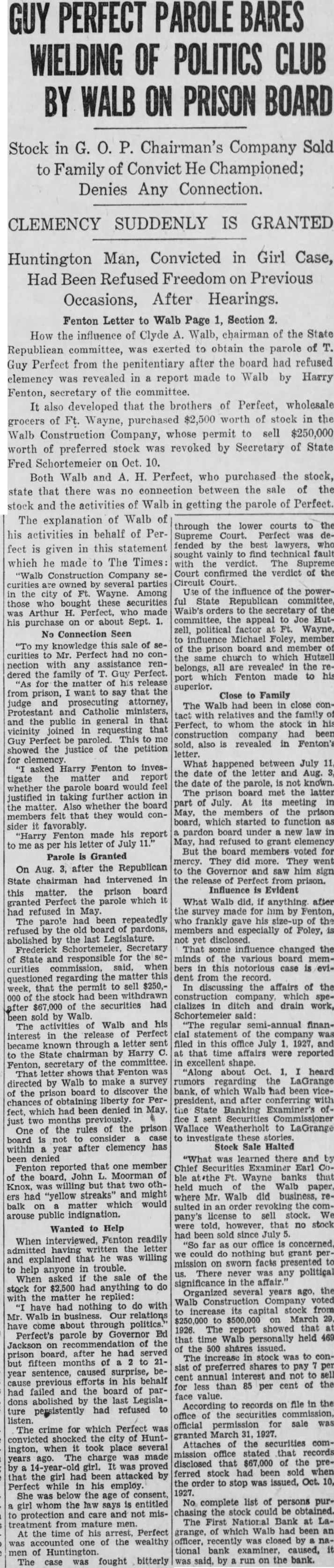 Fenton Letter to Walb Page Section How the influence of Clyde Walb, chairman of the State Republican committee, was exerted to obtain the parole of Guy Perfect from the penitentiary after the board had refused clemency was revealed in report made to Walb by Harry Fenton, secretary of the committee. It also developed that the brothers of Perfect, wholesale grocers of Wayne, purchased worth of stock in the Walb Construction Company, whose permit to sell $250,000 worth of preferred stock was revoked by Secretary of State Fred Schortemeier on Oct. 10. Both Walb and Perfect, who purchased the stock, state that there was no connection between the sale of the the activities of Walb in getting the parole of Perfect. stock and