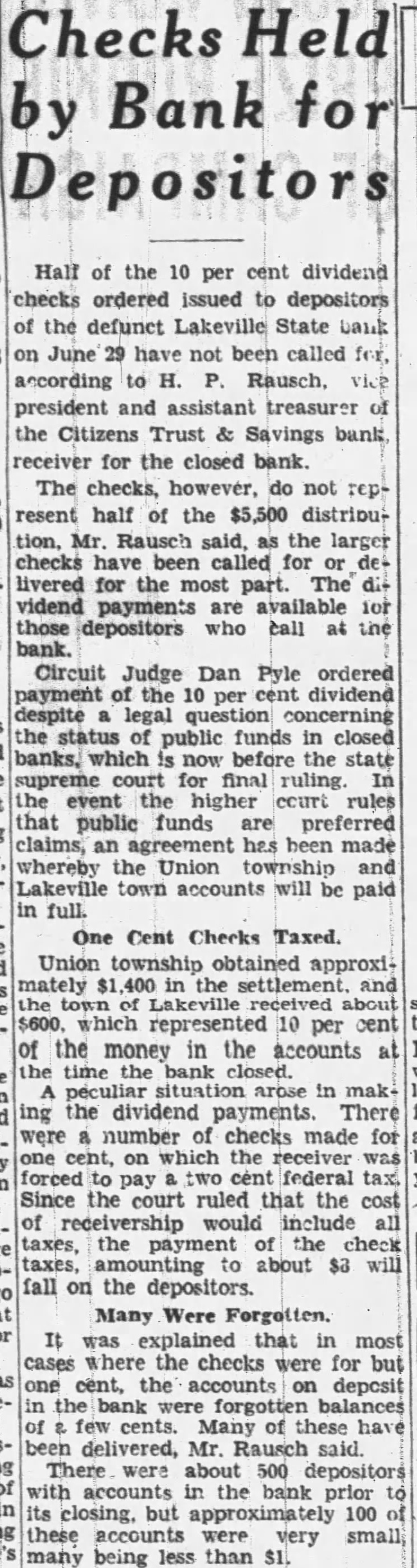 Checks Held Bank by Depositors Half of the 10 per cent dividend checks ordered issued to depositors of the defunct Lakeville State bank on June 29 have not been called according to H. Rausch, president treasurer the Citizens Trust Savings bank receiver for the closed bank. The checks, however, do not represent half of the $5,500 distribution. Mr. said, the larger checks called for livered for the most part. The dit vidend payments are available for those depositors who call the bank. Circuit Judge Dan Pyle ordered payment of dividend despite legal question status public funds closed banks, which now before the state supreme court for the event higher public funds preferred claims, an agreement has been made whereby the Union township Lakeville town accounts be full. One Cent Checks Taxed. Union township obtained approximately the settlement. Lakeville about which represented 10 per cent the money in the accounts the time the bank closed. situation arose in making dividend payments. There were number checks made for cent, which the receiver was forced federal tax. Since the court ruled that the cost of would include about $3 will fall on the depositors. Many Were Forgotten. It was explained that in most cases where the checks were for but was cent, the accounts deposit balances cents. of these have Mr. said. were about 500 the bank prior closing, but 100 these very many being less than $1.