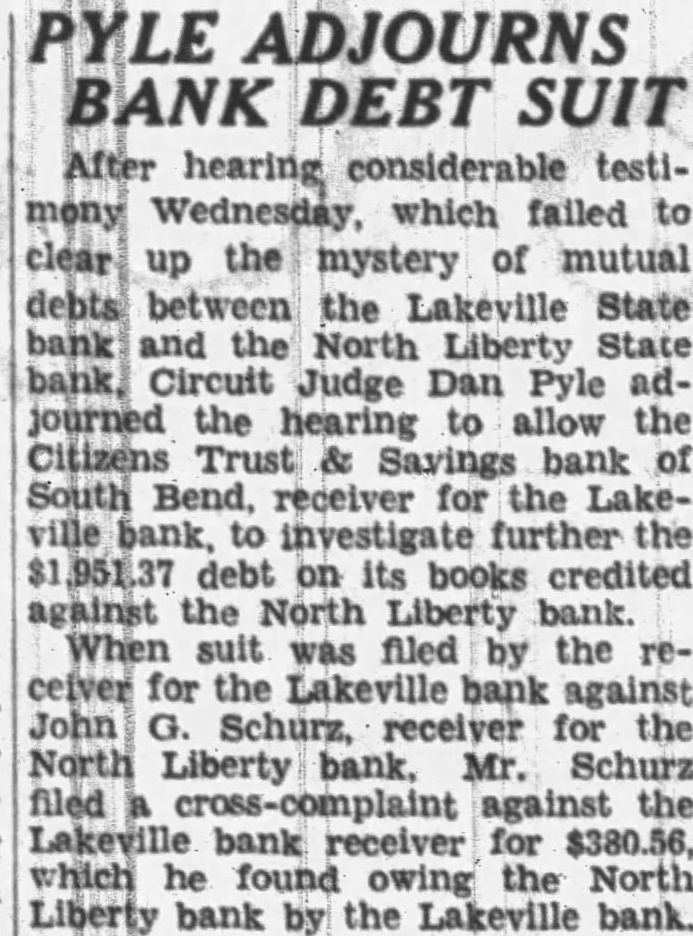 PYLE ADJOURNS BANK DEBT SUIT After hearing considerable testimony Wednesday, which failed to clear up the mystery of mutual debts between the Lakeville State bank and the North Liberty State bank, Circuit Judge Dan Pyle adjourned the hearing to allow the Citizens Trust & Savings bank of South Bend, receiver for the Lakeville bank, to investigate further the $1 951.37 debt on its books credited against the North Liberty bank. When suit was filed by the receiver for the Lakeville bank against John G. Schurz, receiver for the North Liberty bank. Mr. Schurz filed a cross-complaint against the Lakeville bank receiver for $380.56, which he found owing the North Liberty bank by the Lakeville bank.