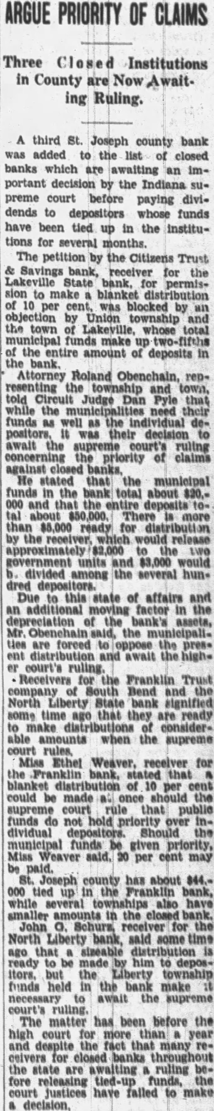 ARGUE PRIORITY OF CLAIMS Three Closed Institutions in County are Now Awaiting Ruling. A third St. Joseph county bank was added to the list of closed banks which are awaiting an important decision by the Indiana supreme court before paying dividends to depositors whose funds have been tied up in the institutions for several months. The petition by the Citizens Trust Savings bank, receiver for the Lakeville State bank. for permission to make blanket distribution of 10 cent, was blocked by objection by Union township and the town of Lakeville, whose total municipal funds make up two-fifths of the entire amount of deposits in the bank. Attorney Roland Obenchain, representing the and town, told Circuit Judge Dan Pyle that while the need their funds as well as the individual depositors, It was their decision await the supreme court's ruling concerning the priority of claims against closed He stated that the municipal funds in the bank total about $20.000 and that the entire deposits tal about $50,000. There is more than $5,000 ready for distribution by the receiver, which would release approximately $2,000 to the LWO government units and $3,000 would divided among the several hundred Due to this state of affairs and additional moving factor in the depreciation of the bank's assets, Mr. said, the municipalities are forced to oppose the pres. ent distribution and await the highor court's ruling. Receivers for the Franklin Trust company of South Bend and the North Liberty State bank signified some time ago that they are ready to make distributions of considerable amounts when the supreme court rules, Miss Ethel Weaver, receiver for the Franklin bank. stated that blanket distribution of 10 per could be made once should the supreme court that public funds do not hold priority over individual depositors. Should the municipal funds be given priority, Miss Weaver said. 20 per cent may be paid. St. Joseph county has about $44.000 tied up in the Franklin bank, while several townships also have smaller amounts in the closed bank. John G. Schurs, receiver for the North Liberty bank, said some time ago that sizeable distribution is ready to be made to depositors. but the Liberty township funds held in the bank make necessary await the supreme court's ruling. The matter has been before the high court for more than year and despite the fact that many receivers for closed banks throughout the state are awaiting ruling before releasing funds, the court justices have failed to make a decision.