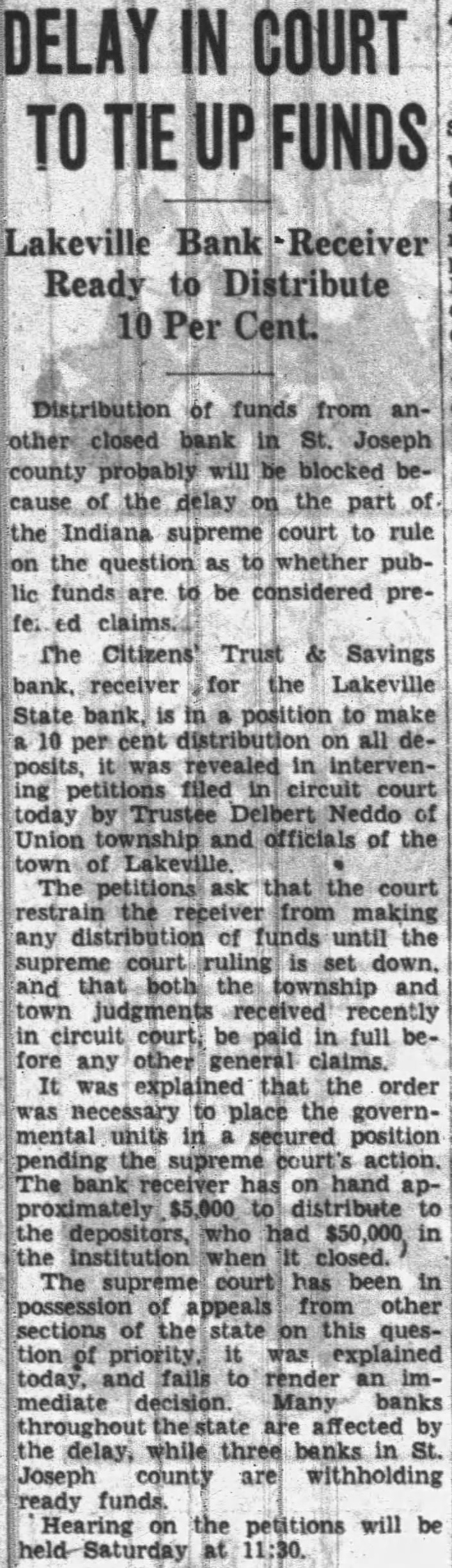 DELAY IN COURT TO TIE UP FUNDS Lakeville Bank Receiver Ready to Distribute 10 Per Cent. Distribution of funds from another closed bank in St. Joseph county probably will be blocked because of the delay on the part of the Indiana supreme court to rule on the question as to whether public funds are to be considered prefe: ed claims. The Citizens Trust & Savings bank, receiver for the Lakeville State bank, is in a position to make a 10 per cent distribution on all deposits, it was revealed in intervening petitions filed in court today by Trustee Delbert Neddo of Union township and officials of the town of The petitions ask that the court restrain the receiver from making any distribution of funds until the court is set and that both the township and town judgments received recently in circuit court, be paid in full before any other general claims. It was explained that the order was necessary to place the governmental units in a secured position pending the supreme court's action. The bank receiver has on hand approximately $5,000 to distribute to the depositors, who had $50,000, in the institution when closed. The supreme court has been in possession of ppeals from other sections of the state on this question of priority. it was explained today, and fails to render an immediate decision. Many banks throughout the state are affected by the delay, while three banks in St. Joseph county are withholding ready Hearing on the petitions will be held- Saturday at 11:30.