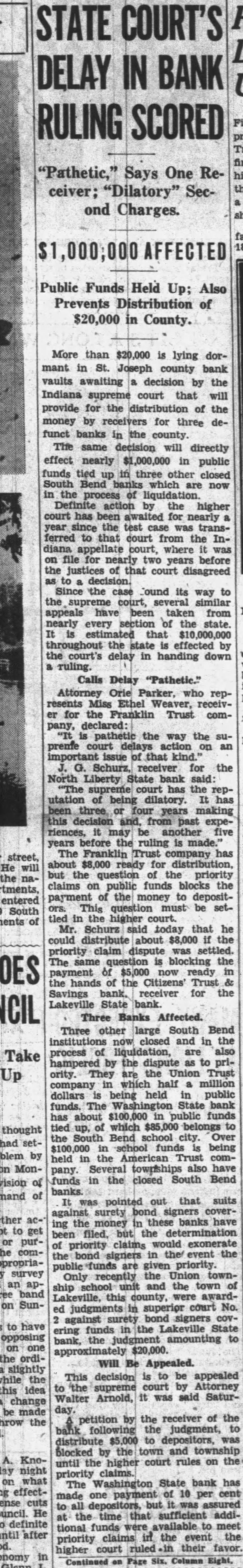 STATE COURT'S DELAY IN BANK RULING SCORED "Pathetic," Says One Receiver; "Dilatory" Second Charges. AFFECTED Public Funds Held Up; Also Prevents Distribution of $20,000 in County. More than $20,000 is lying dormant in St. Joseph county bank vaults awaiting decision by the Indiana supreme court that will provide for the distribution of the money by receivers for three defunct banks in the county. The same decision will directly effect nearly $1,000,000 in public funds tied up in three other closed South Bend which are now in the liquidation. Definite action by the higher court has been for nearly since the test case was transferred to that court from the Indiana court, where on file nearly two years before justices of that court disagreed decision. Since the Cound its way to the supreme court, several similar appeals have been taken from every section of the state. estimated that throughout the state effected by court's delay in handing down ruling. Calls Delay Attorney Orie Parker, who represents Miss Ethel receivfor the Franklin Trust company, declared: pathetic the way the court delays action on an important issue of that kind.' Schurz, receiver for the North Liberty State bank said: supreme court has the reputation being dilatory. or years making decision and, from past experiences, another five years before the ruling is made. The Franklin company has about $8,000 for the question the priority claims on public funds blocks the payment the money to depositThis question must be setin the higher Mr. Schurz said today that he could distribute about $8,000 if the priority claim dispute was The blocking the payment $5,000 ready the hands of Citizens' Trust Savings bank. receiver for Lakeville State bank Three Banks Affected. Three other large South Bend closed and in the process liquidation, are also hampered by the dispute to priority. They are Union Trust company half million dollars being held in public funds. The bank about $100,000 public funds tied up, of which $85,000 belongs to Bend school Over $100,000 school funds being held the American Trust comSeveral townships also have pany. funds in the closed South Bend banks. was pointed out that suits against surety bond signers coverthe money these banks have ing but determination been priority claims would exonerate the bond signers in event the public funds are given priority. Only recently the Union ship the town of this county, awarded in superior court No. against bond covering in Lakeville State the amounting to bank, $20,000. Will Be Appealed. This decision to be appealed the supreme court Attorney Walter Arnold, was said Saturday. petition by the receiver of the following the judgment, distribute blocked by town and until the higher court rules on the claims. The Washington State bank has one payment of 10 per but time that sufficient addithe tional funds were available to meet claims in the event the priority court ruled their favor. higher Continued Page Six. Column