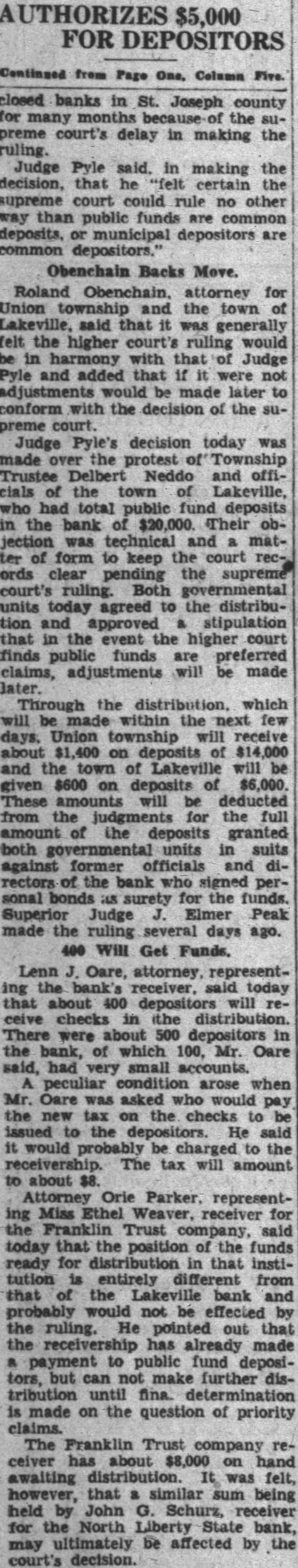 AUTHORIZES $5,000 FOR DEPOSITORS Continued from Page One, Column Five. closed banks in St. Joseph county for many the supreme court's delay in making the ruling. Judge Pyle said. in making the decision, that he certain the supreme court could rule no other way than public funds are common deposits. or municipal depositors are common depositors Obenchain Backs Move. Roland Obenchain. attorney for Union township and the town of Lakeville. said that it was generally felt the higher court's ruling would be in harmony with that of Judge Pyle and added that if were not adjustments would be later to conform with the decision of the supreme court. Judge Pyle's decision today was made the protest of Township Trustee Delbert Neddo and officials of the town of Lakeville, who had total public fund deposits in the bank of $20,000. Their 00jection was technical and matter of form to keep the court records clear pending the supreme court's ruling. Both governmental units today agreed to the distribution and approved stipulation that in the event the higher court finds public funds are preferred claims, adjustments will be made later. Through the distribution. which will be made within the next few days. Union township will receive about $1,400 on deposits of $14,000 and the town of Lakeville will be given $600 on deposits of $6,000 These will be deducted from the judgments for the full amount of the deposits granted both units in suits against former officials and directors of the bank who signed personal bonds as surety for the funds. Superior Judge Elmer Peak made the ruling several days ago. 400 Will Get Funds. Lenn J. Oare, attorney, representing the bank's receiver, said today that about 400 depositors will receive checks in the distribution. There were about 500 depositors in the bank, of which 100, Mr. Oare said, had very small accounts. peculiar condition arose when Mr. Oare was asked who would pay the new tax on the checks to be issued to the depositors. He said it would probably be charged to the receivership. The tax will amount to about $8. Attorney Orie Parker. representing Miss Ethel Weaver, receiver for the Franklin Trust company, said today that the position of the funds ready for distribution in that institution is entirely different from that of the Lakeville bank and probably would not be effected by the ruling. He pointed out that the receivership has already made payment to public fund depositors, but can not make further distribution until fina. determination is made on the question of priority claims. The Franklin Trust company receiver has about $8,000 on hand awaiting distribution. It was felt, however, that similar sum being held by John G. Schurz, receiver for the North Liberty State bank, may ultimately be affected by the court's decision.