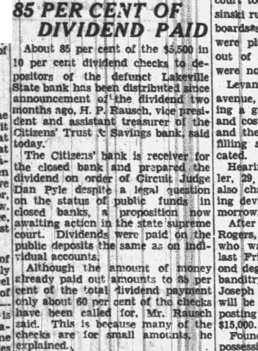 85 PER OF DIVIDEND PAID About 85 of the out of per cent dividend checks positors of the defunct Lakeville Levan State bank has dividend two months ago, Rausch, presi- ing dent and the and Citizens' Trust Savings said today. The Citizens' is receiver cated. the closed bank and dividend on order of Circuit Judge ler, Dan Pyle despite legal question on the status public funds in ing closed banks, proposition morrow. awaiting action the state supreme After court. Dividends were paid Rogers, public deposits as on was vidual accounts, last Although the amount of money already paid out amounts 85 banditry, the dividend Joseph about cent the checks will been called Mr. Rausch posting This many checks small he Found explained. possession
