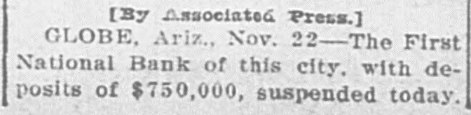 The First National Bank of Globe ... did not open for business this morning, having been dropped by the Globe Clearing House Association last night. ... The heavy drawing of exchange since the suspension of the Globe National Bank is believed to be the cause of the suspension. Territorial Bank Examiner J. H. Page took charge of the suspended bank.