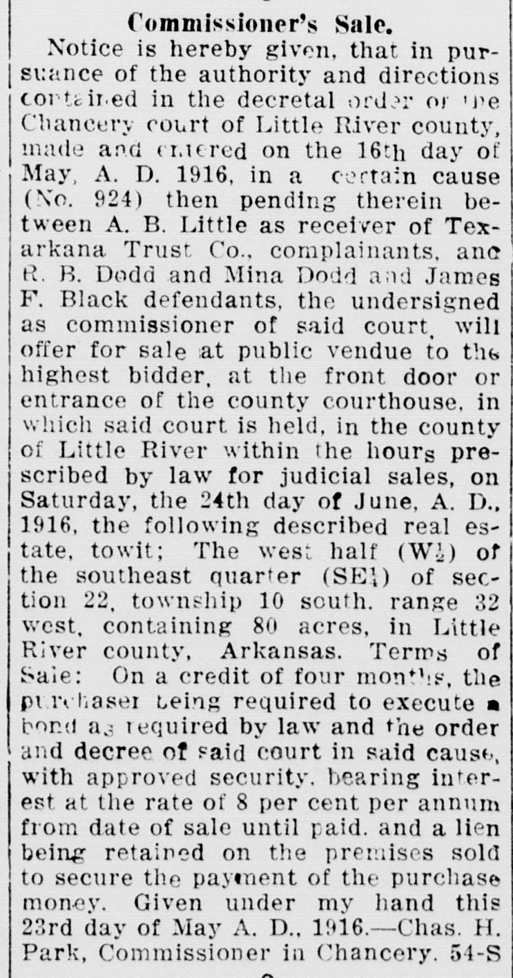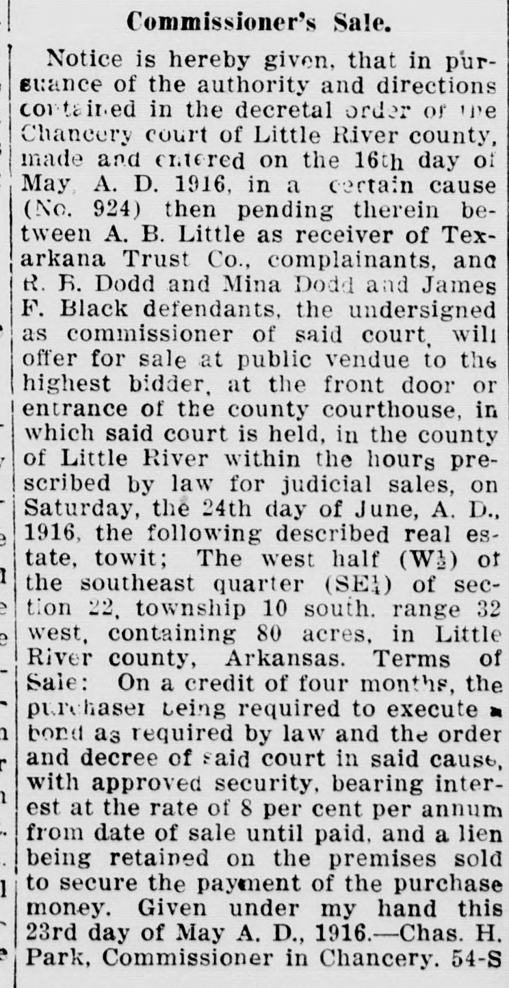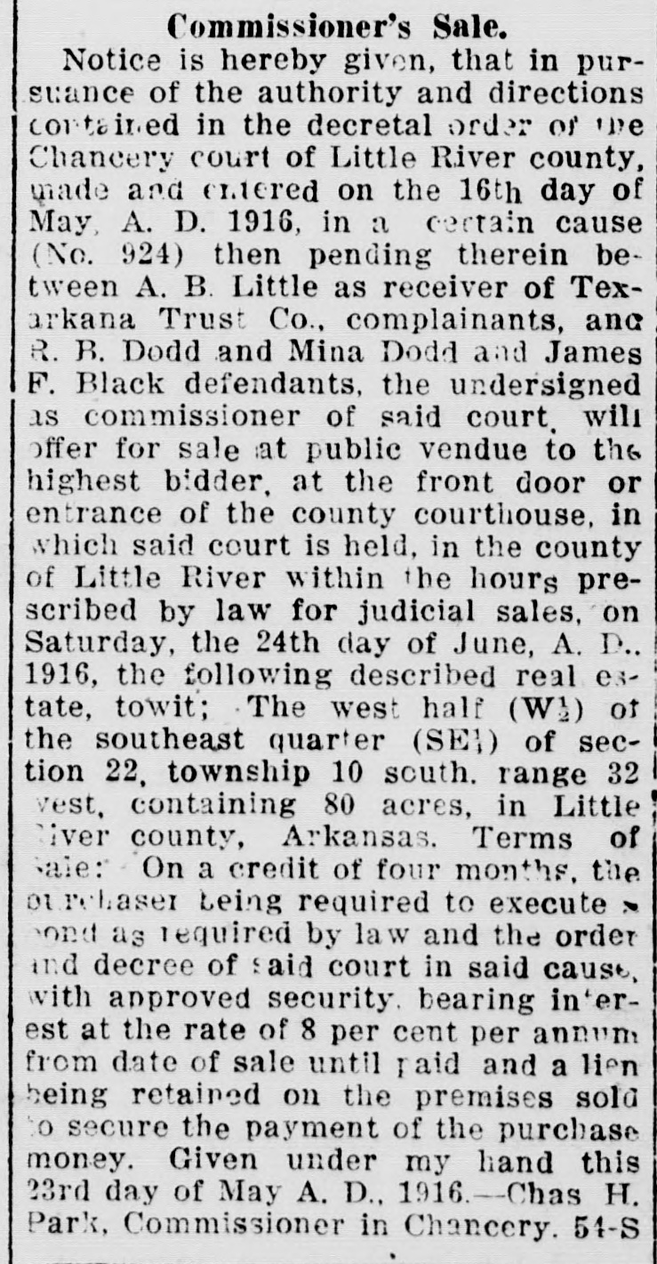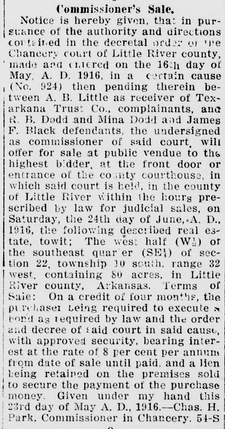 Commissioner's Sale. Notice is hereby given, that in pursuance of the authority and directions contained in the decretal order or we Chancery court of Little River county, made and entered on the 16:11 day of May, A. D. 1916, in a certain cause (No. 924) then pending therein between A. B. Little as receiver of Texarkana Trust Co., complainants, and R. B. Dodd and Mina Dodd and James F. Black defendants, the undersigned as commissioner of said court, will offer for sale at public vendue to the highest bidder, at the front door or entrance of the county courthouse, in which said court is held, in the county of Little River within the hours prescribed by law for judicial sales, on Saturday, the 24th day of June, A. D., 1916, the following described real estate, towit; The west half (W½) or the southeast quar er (SE1) of section 22. township 10 south. range 32 west, containing 80 acres, in Little River county, Arkansas. Terms of Sale: On a credit of four months, the purchaser teing required to execute = bond as required by law and the order and decree of said court in said cause, with approved security, bearing interest at the rate of 8 per cent per annum from date of sale until paid, and a lien being retained on the premises sold to secure the payment of the purchase money. Given under my hand this 23rd day of May A. D., 1916.-Chas. H. Park, Commissioner in Chancery. 54-S