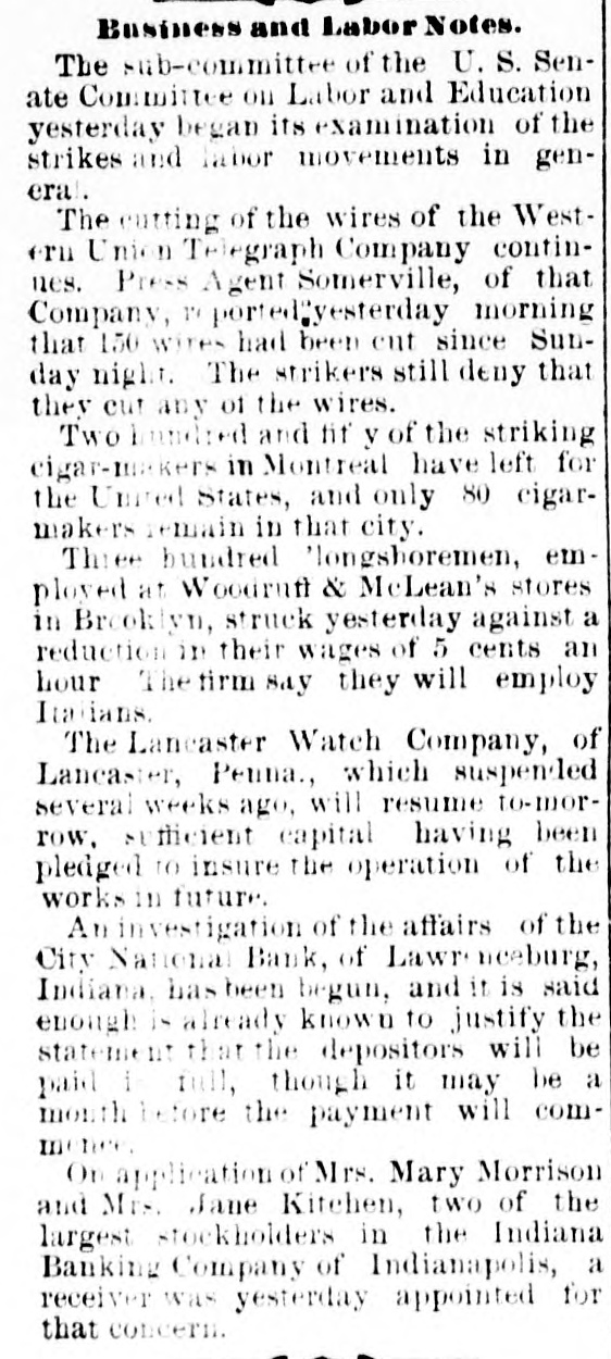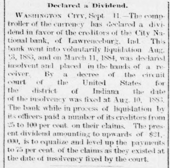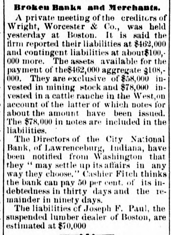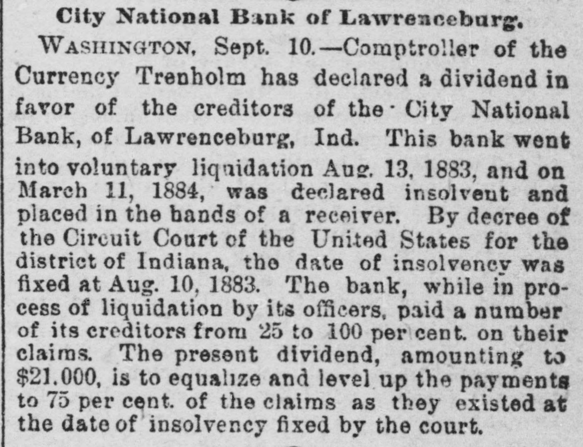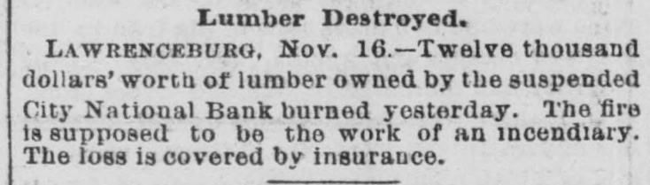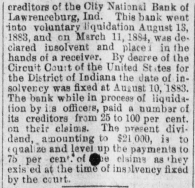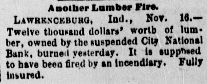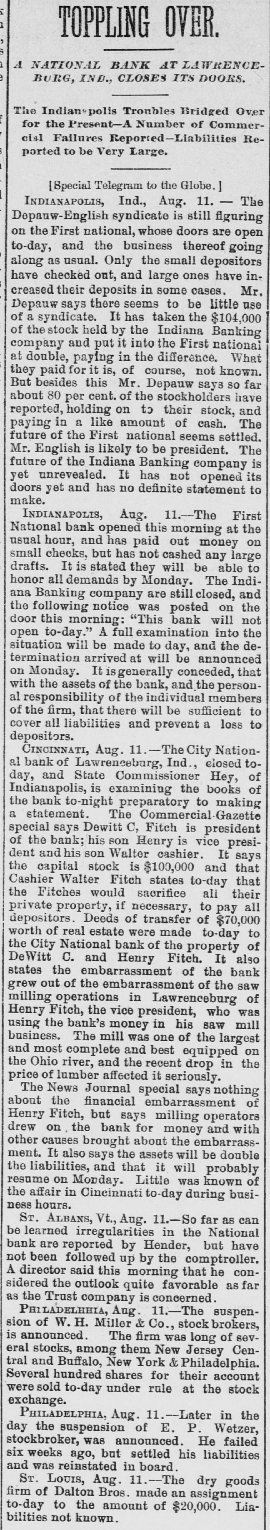 TOPPLING OVER. A NATIONAL BANK ATLAWRENCEBURG, IND., CLOSE$ ITS DOORS. The Indian&polis Troubles Bridged Over £ for the Present-A Number of Commercisl Failures Reported-Liabilities Reported to be Very Large. [Special Telegram to the Globe.] INDIANAPOLIS, Ind., Aug. 11. - The Depauw-English syndicate is still figuring on the First national, whose doors are open to-day, and the business thereof going along as usual. Only the small depositors have checked out, and large ones have increased their deposits in some cases. Mr. Depauw says there seems to be little use of a syndicate. It has taken the $104,000 of the stock held by the Indiana Banking company and put it into the First national at double, paying in the difference. What they paid for is, of course, not known. But besides this Mr. Depauw says so far about 80 on and reported, per holding cent. of the to stockholders their stock, have in a The paying of the First like amount national of cash. future seems settled. Mr. English is likely to be president. The future of the Indiana Banking company is yet unrevealed. It has not opened its doors yet and has no definite statement to make. INDIANAPOLIS, Aug. 11.--The First National bank opened this morning at the usual hour, and has paid out money on small checks, but has not cashed any large drafts. It is stated they will be able to honor all demands by Monday. The Indiana Banking company are still closed, and the was on the door this not following morning: notice "This posted bank will A full the open to-day." examination day, and into the situation will be made to determination arrived at will be announced on Monday. It sgenerally conceded, that with the assets of the bank, and the personal responsibility of the individual members of the firm, that there will be sufficient to cover all liabilities and prevent a loss to depositors. CINCINNATI, Aug. -The City National bank of Lawrenceburg, Ind. closed today, and State Commissioner Hey, of Indianapolis, is examining the books of the bank to-night preparatory to making a statement. The Commercial-Gazette special says Dewitt C, Fitch is president of the bank; his son Henry is vice president and his son Walter cashier. It says the capital stock is $100,000 and that Cashier Walter Fitch states to-day that the Fitches would sacrifice all their private property, if necessary, to pay all depositors. Deeds of transfer of $70,000 worth of real estate were made to-day to the of DeWitt and also City National C. bank Henry of the Fitch. property It states the embarrassment of the bank grew out of the embarrassment of the saw milling operations in Lawrenceburg of Henry Fitch, the vice president, who was using the bank's money in his saw mill business. The mill was one of the largest and most complete and best equipped on the Ohio river, and the recent drop in the price of lumber affected it seriously. The News Journal special says nothing about the financial embarrassment of Henry Fitch, but says milling operators drew on the bank for money and with other causes brought about the embarrassment. It also says the assets will be double the liabilities, and that it will probably resume on Monday. Little was known of the affair in Cincinnati to-day during business hours. ST. ALBANS, Vt., Aug. 11.-So far as can be learned irregularities in the National bank are reported by Hender, but have not been followed up by the comptroller. A director said this morning that he considered the outlook quite favorable as far as the Trust company is concerned. PHILADELHHIA, Aug. 11.-The suspension of W. H. Miller & Co., stock brokers, is announced. The firm was long of several stocks, among them New Jersey Central and Buffalo, New York & Philadelphia. Several hundred shares for their account were sold to-day under rule at the stock exchange. PHILADELPHIA, Aug. 11.--Later in the day the suspension of E. P. Wetzer, stockbroker, was announced. He failed six weeks ago, but settled his liabilities and was reinstated in board. ST. LOUIS, Aug. 1.--The dry goods firm of Dalton Bros. made an assignment to-day to the amount of $20,000. Liabilities not known.