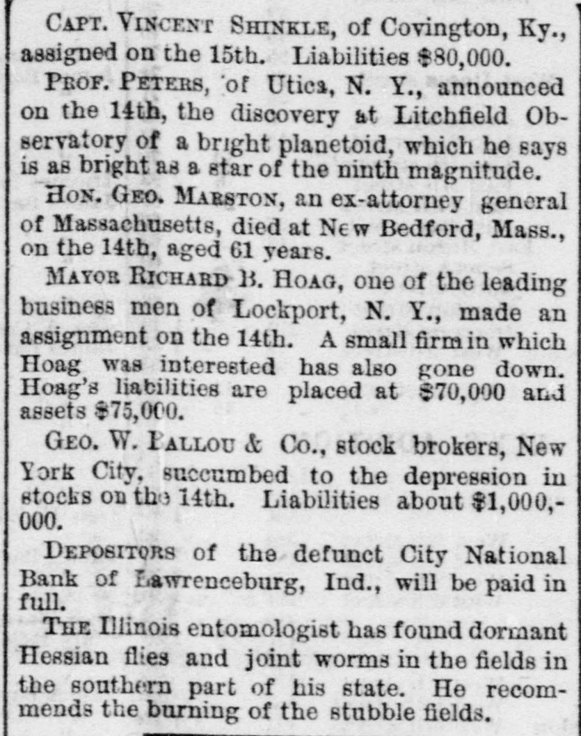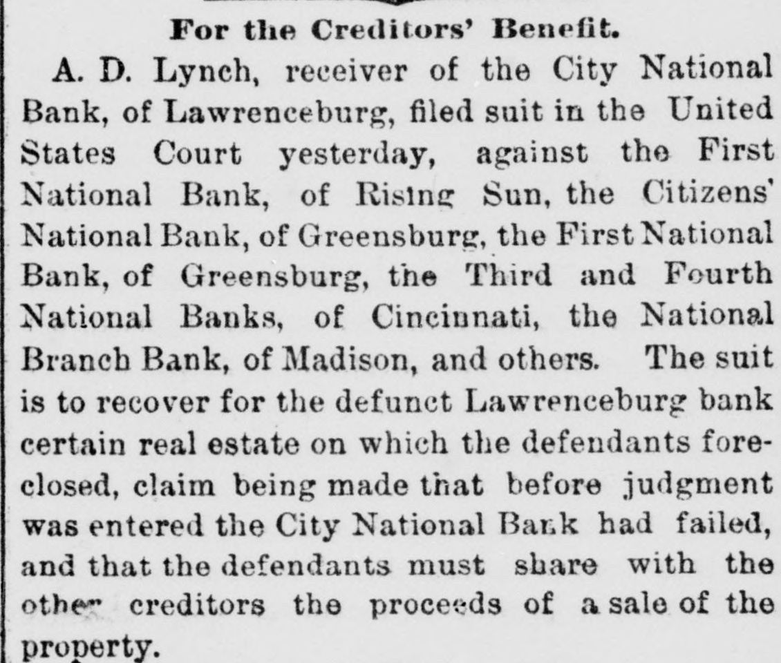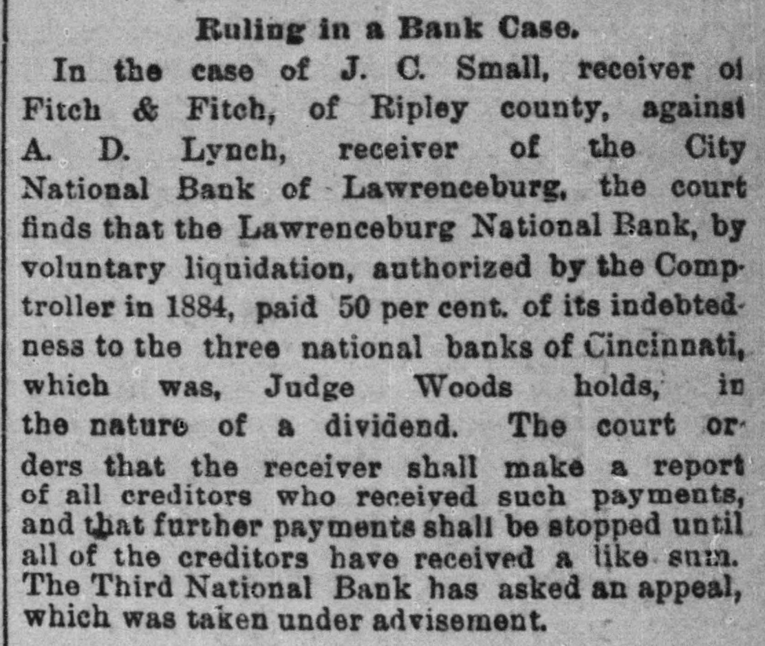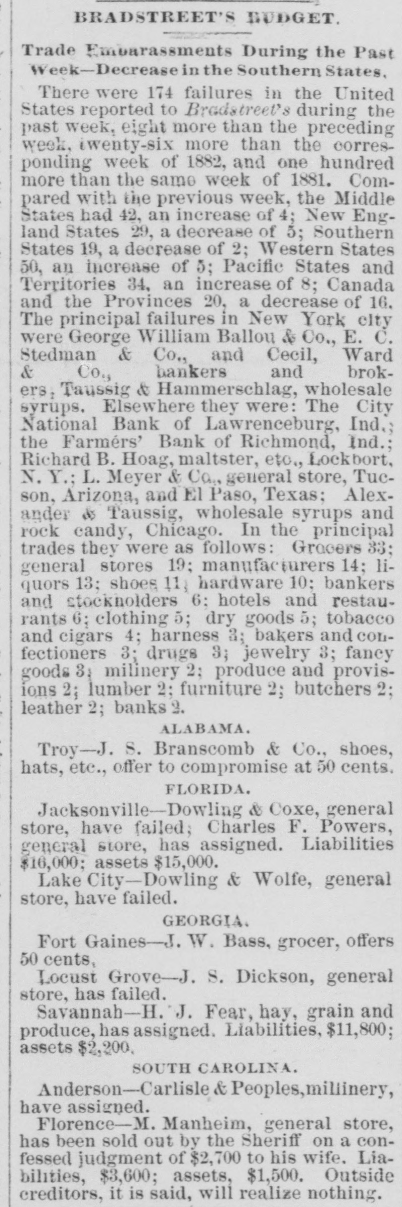 TOPPLING OVER. A NATIONAL BANK ATLAWRENCEBURG, IND., CLOSE$ ITS DOORS. The Indian&polis Troubles Bridged Over £ for the Present-A Number of Commercisl Failures Reported-Liabilities Reported to be Very Large. [Special Telegram to the Globe.] INDIANAPOLIS, Ind., Aug. 11. - The Depauw-English syndicate is still figuring on the First national, whose doors are open to-day, and the business thereof going along as usual. Only the small depositors have checked out, and large ones have increased their deposits in some cases. Mr. Depauw says there seems to be little use of a syndicate. It has taken the $104,000 of the stock held by the Indiana Banking company and put it into the First national at double, paying in the difference. What they paid for is, of course, not known. But besides this Mr. Depauw says so far about 80 on and reported, per holding cent. of the to stockholders their stock, have in a The paying of the First like amount national of cash. future seems settled. Mr. English is likely to be president. The future of the Indiana Banking company is yet unrevealed. It has not opened its doors yet and has no definite statement to make. INDIANAPOLIS, Aug. 11.--The First National bank opened this morning at the usual hour, and has paid out money on small checks, but has not cashed any large drafts. It is stated they will be able to honor all demands by Monday. The Indiana Banking company are still closed, and the was on the door this not following morning: notice "This posted bank will A full the open to-day." examination day, and into the situation will be made to determination arrived at will be announced on Monday. It sgenerally conceded, that with the assets of the bank, and the personal responsibility of the individual members of the firm, that there will be sufficient to cover all liabilities and prevent a loss to depositors. CINCINNATI, Aug. -The City National bank of Lawrenceburg, Ind. closed today, and State Commissioner Hey, of Indianapolis, is examining the books of the bank to-night preparatory to making a statement. The Commercial-Gazette special says Dewitt C, Fitch is president of the bank; his son Henry is vice president and his son Walter cashier. It says the capital stock is $100,000 and that Cashier Walter Fitch states to-day that the Fitches would sacrifice all their private property, if necessary, to pay all depositors. Deeds of transfer of $70,000 worth of real estate were made to-day to the of DeWitt and also City National C. bank Henry of the Fitch. property It states the embarrassment of the bank grew out of the embarrassment of the saw milling operations in Lawrenceburg of Henry Fitch, the vice president, who was using the bank's money in his saw mill business. The mill was one of the largest and most complete and best equipped on the Ohio river, and the recent drop in the price of lumber affected it seriously. The News Journal special says nothing about the financial embarrassment of Henry Fitch, but says milling operators drew on the bank for money and with other causes brought about the embarrassment. It also says the assets will be double the liabilities, and that it will probably resume on Monday. Little was known of the affair in Cincinnati to-day during business hours. ST. ALBANS, Vt., Aug. 11.-So far as can be learned irregularities in the National bank are reported by Hender, but have not been followed up by the comptroller. A director said this morning that he considered the outlook quite favorable as far as the Trust company is concerned. PHILADELHHIA, Aug. 11.-The suspension of W. H. Miller & Co., stock brokers, is announced. The firm was long of several stocks, among them New Jersey Central and Buffalo, New York & Philadelphia. Several hundred shares for their account were sold to-day under rule at the stock exchange. PHILADELPHIA, Aug. 11.--Later in the day the suspension of E. P. Wetzer, stockbroker, was announced. He failed six weeks ago, but settled his liabilities and was reinstated in board. ST. LOUIS, Aug. 1.--The dry goods firm of Dalton Bros. made an assignment to-day to the amount of $20,000. Liabilities not known.