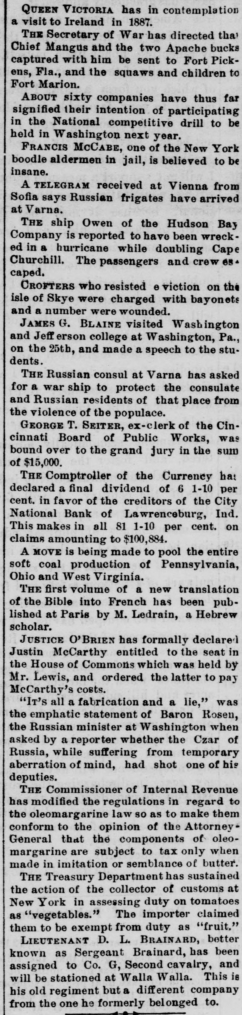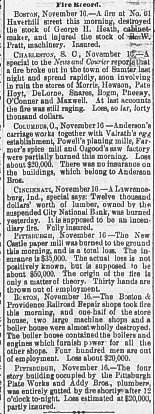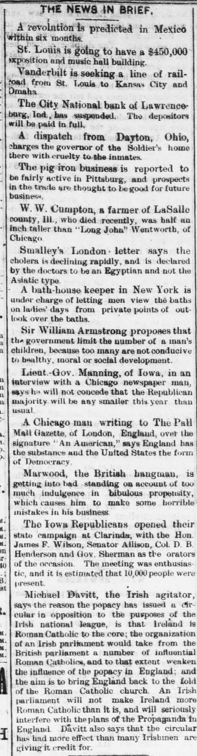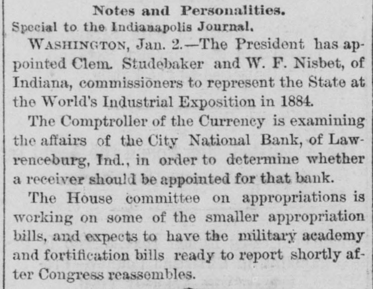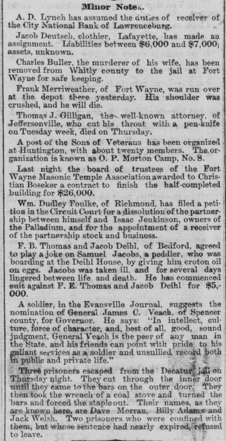 TOPPLING OVER. A NATIONAL BANK ATLAWRENCEBURG, IND., CLOSE$ ITS DOORS. The Indian&polis Troubles Bridged Over £ for the Present-A Number of Commercisl Failures Reported-Liabilities Reported to be Very Large. [Special Telegram to the Globe.] INDIANAPOLIS, Ind., Aug. 11. - The Depauw-English syndicate is still figuring on the First national, whose doors are open to-day, and the business thereof going along as usual. Only the small depositors have checked out, and large ones have increased their deposits in some cases. Mr. Depauw says there seems to be little use of a syndicate. It has taken the $104,000 of the stock held by the Indiana Banking company and put it into the First national at double, paying in the difference. What they paid for is, of course, not known. But besides this Mr. Depauw says so far about 80 on and reported, per holding cent. of the to stockholders their stock, have in a The paying of the First like amount national of cash. future seems settled. Mr. English is likely to be president. The future of the Indiana Banking company is yet unrevealed. It has not opened its doors yet and has no definite statement to make. INDIANAPOLIS, Aug. 11.--The First National bank opened this morning at the usual hour, and has paid out money on small checks, but has not cashed any large drafts. It is stated they will be able to honor all demands by Monday. The Indiana Banking company are still closed, and the was on the door this not following morning: notice "This posted bank will A full the open to-day." examination day, and into the situation will be made to determination arrived at will be announced on Monday. It sgenerally conceded, that with the assets of the bank, and the personal responsibility of the individual members of the firm, that there will be sufficient to cover all liabilities and prevent a loss to depositors. CINCINNATI, Aug. -The City National bank of Lawrenceburg, Ind. closed today, and State Commissioner Hey, of Indianapolis, is examining the books of the bank to-night preparatory to making a statement. The Commercial-Gazette special says Dewitt C, Fitch is president of the bank; his son Henry is vice president and his son Walter cashier. It says the capital stock is $100,000 and that Cashier Walter Fitch states to-day that the Fitches would sacrifice all their private property, if necessary, to pay all depositors. Deeds of transfer of $70,000 worth of real estate were made to-day to the of DeWitt and also City National C. bank Henry of the Fitch. property It states the embarrassment of the bank grew out of the embarrassment of the saw milling operations in Lawrenceburg of Henry Fitch, the vice president, who was using the bank's money in his saw mill business. The mill was one of the largest and most complete and best equipped on the Ohio river, and the recent drop in the price of lumber affected it seriously. The News Journal special says nothing about the financial embarrassment of Henry Fitch, but says milling operators drew on the bank for money and with other causes brought about the embarrassment. It also says the assets will be double the liabilities, and that it will probably resume on Monday. Little was known of the affair in Cincinnati to-day during business hours. ST. ALBANS, Vt., Aug. 11.-So far as can be learned irregularities in the National bank are reported by Hender, but have not been followed up by the comptroller. A director said this morning that he considered the outlook quite favorable as far as the Trust company is concerned. PHILADELHHIA, Aug. 11.-The suspension of W. H. Miller & Co., stock brokers, is announced. The firm was long of several stocks, among them New Jersey Central and Buffalo, New York & Philadelphia. Several hundred shares for their account were sold to-day under rule at the stock exchange. PHILADELPHIA, Aug. 11.--Later in the day the suspension of E. P. Wetzer, stockbroker, was announced. He failed six weeks ago, but settled his liabilities and was reinstated in board. ST. LOUIS, Aug. 1.--The dry goods firm of Dalton Bros. made an assignment to-day to the amount of $20,000. Liabilities not known.