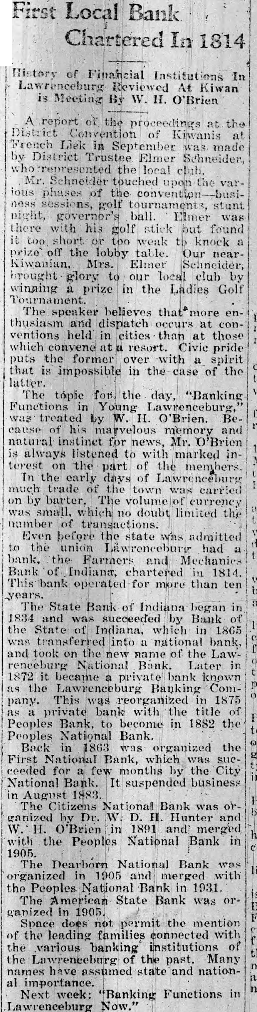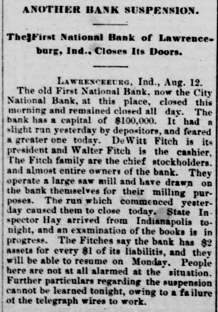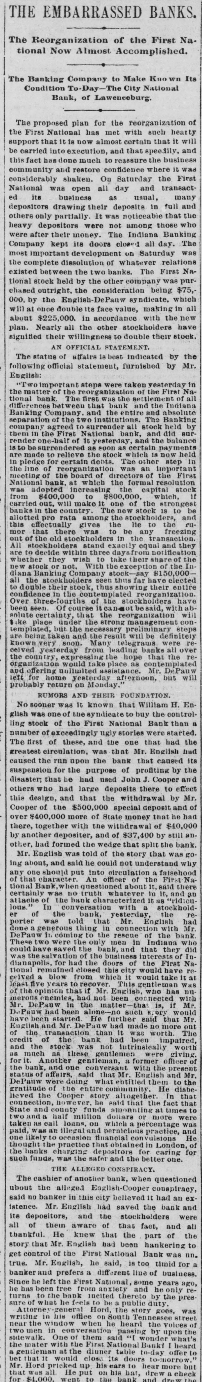 BANKS. THE EMBARRASSED Na Now tional The Reorganization Almost of Accomplished. the First wn Its Kno The Banking Company To-Day The to Make City National Condition Bank, of Lawenceburg. of proposed plan for met the with such that it carried The National has almost certain and to much it where support the First that into execution, now and reassure that specify the busi was be fact has done restore confidence the First National this and On Saturday transact as business in community considerably was shaken. open all day usual, and full many and deposits the ed its drawing their was noticeabie those that who their depositors partially It among Banking others only were not Indiana The doors heavy depositors money. The closed all day. was Saturday complete Company were after kept development its whatever OD relations Na two banks. most important dissolution of The First was purexisted the between the by the other company being which $75, stock held consideration icate. all tional chased outright. the DePauw making in 000, by the double English its face value, with the have new will at once in accordance stockholders stock. about Nearly $225,000. all willingness the other to double their the by plan. signified their OFFICIAL indicated following English: raken vesterday The status official AN of affairs statement, is best furnished by Mr. in of Nathe First of all Indiana "Two matter o of the The first was bank and and the tional the bank etween and that The Banking held by render Banking difference Company of the two urrender stitutions. all stock and did balance sur the company separation reed First to National vesterday bank certain and the held stock other them in one-bair the of it as soon which 18 now step in of at are made besu to for relieve certain debts. zation was The an of imp the ution First adopted to in the pledge line of the reorgania board which of direct the he formal capital which, resol stock of National meeting bank, increa reasing $800,00 the stronges 18 to be was from 00,000 will make it The one newskholders, stock and ru carried out, the country amo ong the the lie to the freezing banks allotted problem rata gives to be any angaction. this effec actually there was holders in the equal and ification they within take mor that old stand exact from In out of the the holders three day their share the are All to decide they wish With to say $150,000. elected whether new or not. Company seen stock thus showing far have their entire all diana the Bankinfolders their stock thus rholders with have confidence double the of it the ca con- will Over seen. three ainty, of course that the atrong management managinary definitely steps been solute place under the the necessary the result will be were over re tike tem being lated, taken but soon. and Many eading banks that all the are KNOWD very westerday from the hope as DePau celved express take place Mr. but will the country would limited afternoon, left for return on and organizering home Monday H. En one glish of probably RUMORS AND known THEIR that buy William the controlthe First No sooner of the it National to were ugly stories of the that had was that ling number stock of xccedingly these, and the that one Mr. English caused nad its for used The first circulation, the bank of profiting by and the there greates caused the run the upon purpose John J. Cooper to effect suspension disaster; that had be large had deposits withdrawal by and Mr. of over the with there, others and that the special money deposit that he bad 000 together of and $37, depositer, this Cooper of the more $500.00 of State 400 of by $40, still an the the that bank wedge split Mr. go was that story English he ing said and could why about, a into put should circul An by other, another bad formed was told of not unde erstand falsehood of the First officer it, said rioned about there in it. an and of the attache In the any of that one character. truth quest whatezed it stockhold "ridicus bank Bank," was no bank characwith tion a the Mr. that had Mr with election the bank bank, lous. er of was told thing the rescue in of Indiana who did inter diana done porter generating rous the only men and that they of Na First fined from DePauw These were the of he doors business of would the have it at This who has could was apolis, for had closed the which this city it wontleman take was nu with tional blow to Mr. English, cot nected if Mr celved years that had if not matte been that is, would Mr the of the in the alone further such said more that The out Mr DePauw had been He had made no worth. the and was Delbeen Pauw started Mr. De Pauw than was been impaired English not officer giving of status were credit of the of stock as these leman, a with the and presen Mr the it. much Anoth Snother and one said conversance that untitled Mr. them He diabe- that the connection for the bank, of fairs, doing hatemunity. fact In that condean State times! half million DePande Cooper the story he more at was which loans, one Heved the nowe funds dollars mercentage entactice, and He likely vilations the London the thougake Thanks such funds better illegal for in caring one. for when bank, conspiracy, it an ex had and ubout The the in this city had saved stockholders the bank were all said no banker Mr. English the fact, the istence. and of that part of depositore, aware that the hankering un. to its of their knew had been Bank was all thankful Mr. He English First National too timid business for story that English, of the he different said, line some of ne only years ago, get true Mr. and prefers First a National and by the preswas on riting Since banker he left free the from incited there duty goes, window he has been the he fre bank Hord kouth the Tenness the upon Bankr "Attorney his office he assing heard wonder by heard offer bet Mr. p! Hord ricked near written the in con of them First National table to-day but all He twelkelk two men One with the dinner doori hear more put the Rebat woul
