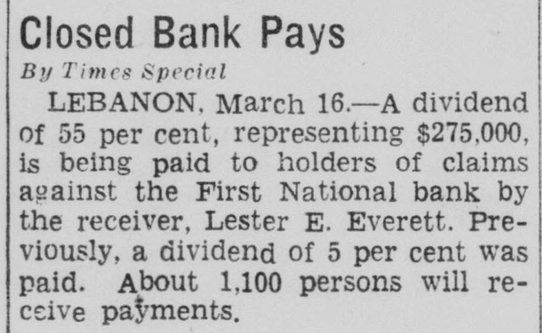 Bank Stock Assessed By Times Special LEBANON, Dec. 27. - Stockholders of the First National bank, which is in receivership, have been ordered by J. F. T. O'Connor, comptroller of the currency, to pay an assessment of $100 on each share of stock. Purpose of the assessment, the comptroller stated, is to raise a fund of $100,000 with which to liquidate the bank's affairs.