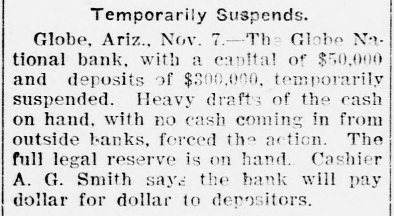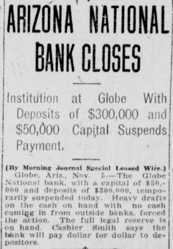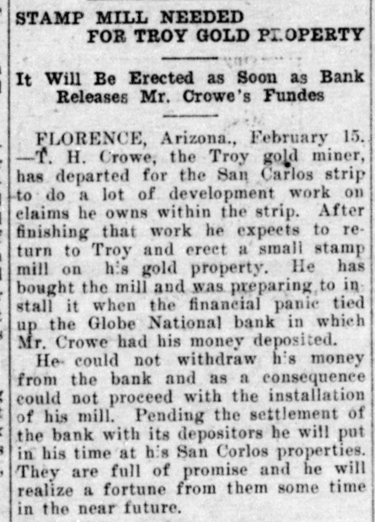 Documents Filed For Record. Arizona Copper Co. file proof of labor on 142 lode and 9 placer claims. J. N. Warden and wife to Bianes & Valdez, bill of sale, $700, 260 stock goats. Richard N. Campbell locates I claim in Copper mt. dist. New England & Clifton Copper Co. file proof of labor on 20 claims in Greenlee dist. H. D. Marshall, Jr., receiver of Globe National Bank files attachment vs. H. P. and L. E. Wightman for $2250 on 37 acres in sec. 2, 4 s, 22 e and n 1 lot 2, blk. 45, Pima. H. D. Marshall, Jr., receiver Globe National Bank, files attachment vs. L. E. Wightman, Wm. H. Butler and S. J. Sims, $5000 upon same land as above, also nw, se and W t se ne, 24, 6 s, 24 e and S 1/2 nw sw, and tract in nw, 33, 5 s, 24 e, lots 3 and 4, blk. 56, and part lot I, blk. 46, Pima (property in Globe). Julius Gribbert and James Talamantes claim 160 acres each and water rights on Eagle creek. Isaac and R. N. Campbell locates 1 claim in Copper mt. dist. John H. Cluff, widower, to E. S. Kimball and R. A. Shipp, deed, $3000, 65 acres in W 1 nw, 29, 6 s, 25 e. Hyrum Brinkerhoff and wife to w. H. and Edw. M. Claridge, deed, $100, 361 acres in se, 35, 6 s, 25 e. Carolota G. Valdez et al to Rev. Emile Barrett, bill of sale, $500, lumber house in Metcalf. Shannon Copper Co. files proof of labor on 9 claims in Greenlee dist. D. L. Dorsey locates 1 claim in Greenlee dist. J. P. Weatherby files proof of labor on 1 claim in Aravaipa dist. Simon Cisneros locates 2 claims in Greenlee and Copper mt. dist. Advance Mining Co. files proof of labor on 9 claims in Black Rock dist. and 19 claims in Clark dist. Robert Coalson et al locate 1 claim 40 mi. ne of Clifton. A. Hannum and wife to R. L. McAllister, deed, $300, lot 1, blk. 5, Smith's add., Safford.