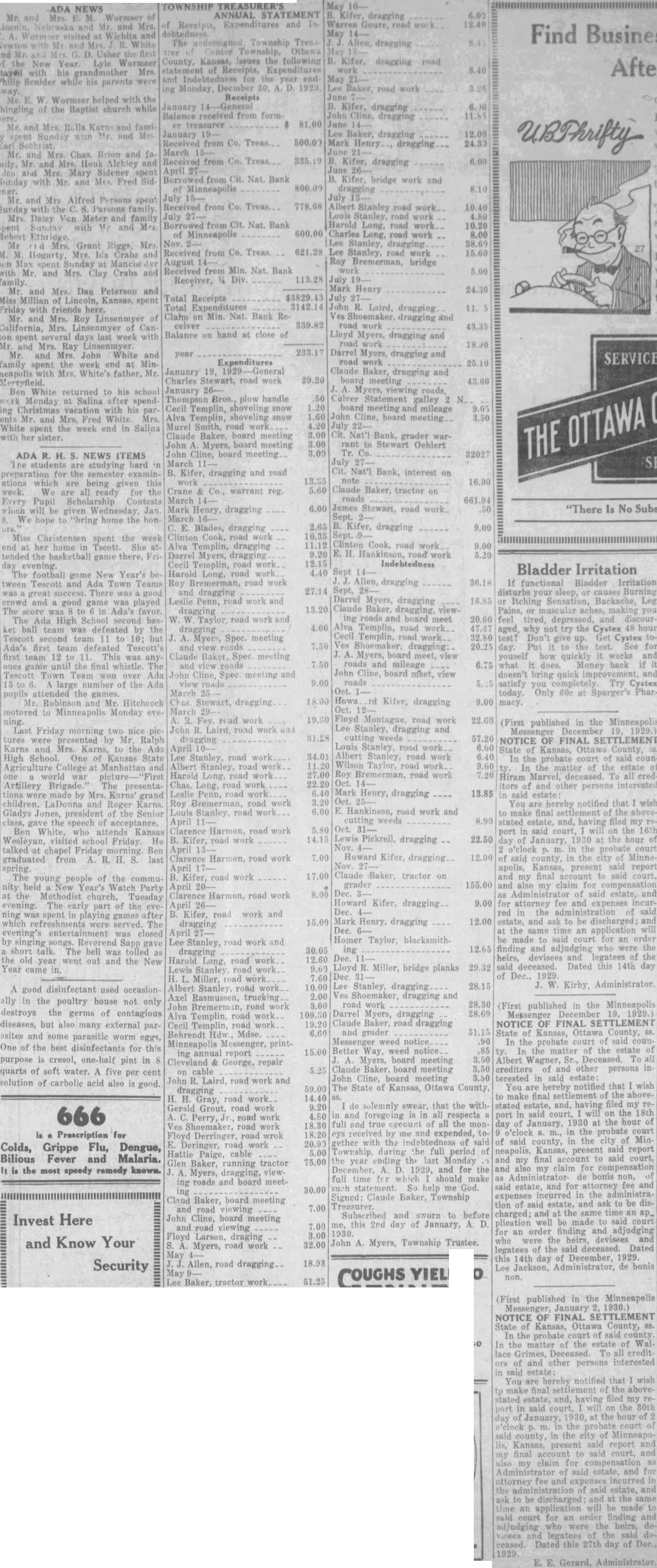 TOWNSHIP TREASURER'S ANNUAL STATEMENT of Receipts, Expenditures and InThe undersigned, Township Treasirer Center Township, Ottawa County, Kansas, issues the following of Receipts, Expenditures and for the year ending Monday, Deember 30, A. D. 1929. Receipts January -General Balance received from formor treasurer 81.00 January Received from Co. Treas 500.00 March Received from Co. Treas 335.19 April Borrowed from Cit. Nat. Bank of Minneapolis 800.00 July 15Received from Co. Treas 778.68 July Borrowed from Cit. Nat. Bank of Minneapolis 600.00 Nov. 2Received from Co. Treas. 621.28 August Received from Min. Nat. Bank Receiver, 1/4 Div. 113.28 Total Receipts Total Expenditures Claim on Min. Nat. Bank Receiver Balance on hand at close of year Expenditures January 19. Charles Stewart, road work January 26Thompson Bros., plow handle Cecil Templin, shoveling snow Alva Templin, shoveling snow Murel Smith, road work Claude Baker, board meeting John Myers, board meeting John Cline, board meeting March B. Kifer, dragging and road work Crane & Co., warrant reg. March 14Mark Henry, dragging March 16E. Blades, dragging Clinton Cook, road work Alva Templin, dragging Darrel Myers, dragging Cecil Templin, road work Harold Long, road work. Roy Bremerman, road work and dragging Leslie Penn, road work and dragging W. W Taylor, road work and dragging J. A. Myers, Spec. meeting and view roads Claude Baker, Spec. meeting and view roads John Cline, Spec. meeting and view roads March 25 Chas. Stewart, dragging March A. R. Fey. road work John R. Laird, road work and dragging April 10Lee Stanley, road work Albert Stanley, road work Harold Long, road work Chas. Long, road work Leslie Penn, road work. Roy Bremerman, road work Louis Stanley, road work. April Clarence Harmon, road work B. Kifer, road work April Clarence Harmon, road work April B. Kifer, road work April 20Clarence Harmon, road work April Kifer, road work and dragging April Lee Stanley, road work and dragging Harold Long. road work Lewis Stanley, road work H. L. Miller, road work Albert Stanley, road work Axel Rasmussen, trucking John Bremerman, road work Alva Templin, road work. Cecil Templin, road work Behrendt Hdw. Mdse. Minneapolis Messenger, printing annual report Cleveland & George, repair on cable John R. Laird, road work and dragging H. H. Gray, road work Gerald Grout, road work A. C. Perry, Jr., road work Ves Shoemaker, road work Floyd Derringer, road wrok E. Deringer, road work Hattie Paige, cable Glen Baker, running tractor A. Myers, dragging, viewing roads and board meeting Claud Baker, board meeting and road viewing John Cline, board meeting and road viewing Floyd Larson, draging S. A. Myers, road work May Allen, road dragging May 9Lee Baker, tractor work 233.17 July 3142.14 John R. Laird, dragging 339.82 road work 29.20 board meeting 50 Calver Statement galley 2 N. 1.20 board meeting and mileage 1.60 John Cline, board meeting. 4.20 July 3.00 Cit. Nat'l Bank, grader war3.00 rant to Stewart Oehlert 3.00 Tr. Co. 13.35 note 5.60 Claude Baker, tractor on 6.00 James Stewart, road work_ 15.00 Better Way, weed notice. A. Myers, board meeting 5.25 Claude Baker, board meeting such statement. So help me God. 30.00 May B. Kifer, dragging 6.00 Warren Goure, road work 12.40 May Allen, dragging May B. Kifer, dragging road work 8.40 May Lee Baker, road work 3.26 June B. Kifer, dragging 6.00 John Cline, dragging 11.65 June Lee Baker, dragging 12.00 Mark Henry dragging 24.30 June B. Kifer, dragging 6.00 B. Kifer, bridge work and dragging 8.10 July Albert Stanley road work 10.40 Louis Stanley, rond work 4.80 Harold Long, road work 10.20 Charles Long, road work 8.00 Lee Stanley, dragging 38.69 Lee Stanley, road work 15.60 Roy Bremerman, bridge work 5.00 July Mark Henry 24.30 Ves Shoemaker, dragging and 43.35 Lloyd Myers, dragging and road work Darrel Myers, dragging and road work 25.10 Claude Baker, dragging and 43.60 Myers, viewing roads, 9.05 3.50 32027 July 27 Cit. Nat'l Bank, interest on 16.00 roads 661.94 Sept. 2.65 B. Kifer, dragging 9.00 10.35 Sept. 11.12 Clinton Cook, road work 9.00 9.20 E. H. Hankinson, road work 5.20 12.15 Indebtedness 4.40 Sept Allen, dragging 36.18 27.14 Sept. 28Darrel Myers, dragging 16.85 13.20 Claude Baker, dragging, viewing roads and board meet 20.60 4.00 Alva Templin, road work. 47.47 Cecil Templin, road work. 32.80 7.50 Ves Shoemaker. dragging: 20.25 Myers, board meet, view 7.50 roads and mileage 6.75 John Cline, board meet, view 9.00 roads Oct. 18.00 Howa rd Kifer, dragging 9.00 macy. Oct. 12Floyd Montague, road work 22.00 Lee Stanley, dragging and 31.28 cutting weeds 57.20 Louis Stanley, road work 6.60 34.01 Albert Stanley, road work 6.40 11.20 Wilson Taylor, road work. 9.60 27.00 Roy Bremerman, road work 7.20 22.20 Oct. 6.40 Mark Henry, dragging 13.85 in said 3.20 Oct. 6.00 E. Hankinson, road work and cutting weeds 8.90 5.80 Oct. 14.15 Lewis Pickrell, dragging 22.50 Nov. 7.00 Howard Kifer, dragging 12.00 Nov. 17.00 Claude Baker, tractor on grader 155.00 8.00 Dec. Howard Kifer, dragging 9.00 Dec. 15.00 Mark Henry, dragging 12.00 Dec. Homer Taylor, blacksmith30.05 ing 12.65 12.60 Dec. 9.60 Lloyd R. Miller, bridge planks 29.32 Dec. of Dec., 7.60 10.00 Lee Stanley, dragging 28.15 2.00 Ves Shoemaker, dragging and 3.00 road work 28.30 109.30 Darrel Myers, dragging 28.69 19.20 Claude Baker, road dragging and grader 51.15 6.60 Messenger weed notice. .90 .85 3.50 3.50 John Cline, board meeting 3.50 terested 59.00 The State of Kansas, Ottawa County, 14.40 9.20 do solemnly swear, that the with4.80 in and foregoing is in all respects 18.30 full and true account of all the mon18.20 eys received by me and expended, to20.90 gether with the indebtedness of said 5.00 Township, during the full period of 75.00 the year ending the last Monday December, A. D. 1929, and for the full time for which should make Signed: Claude Baker, Township 7.00 Subscribed and sworn to before 7.00 me, this 2nd day of January, A. D. 1930. 3.00 John A. Myers, Towns