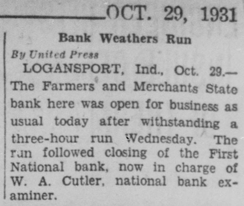 OCT. 29, 1931 Bank Weathers Run By. United Press LOGANSPORT, Ind., Oct. 29.The Farmers and Merchants State bank here was open for business as usual today after withstanding a three-hour run Wednesday. The run followed closing of the First National bank, now in charge of W. A. Cutler, national bank examiner.
