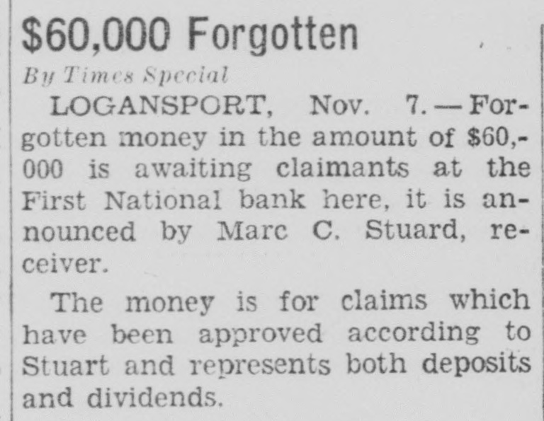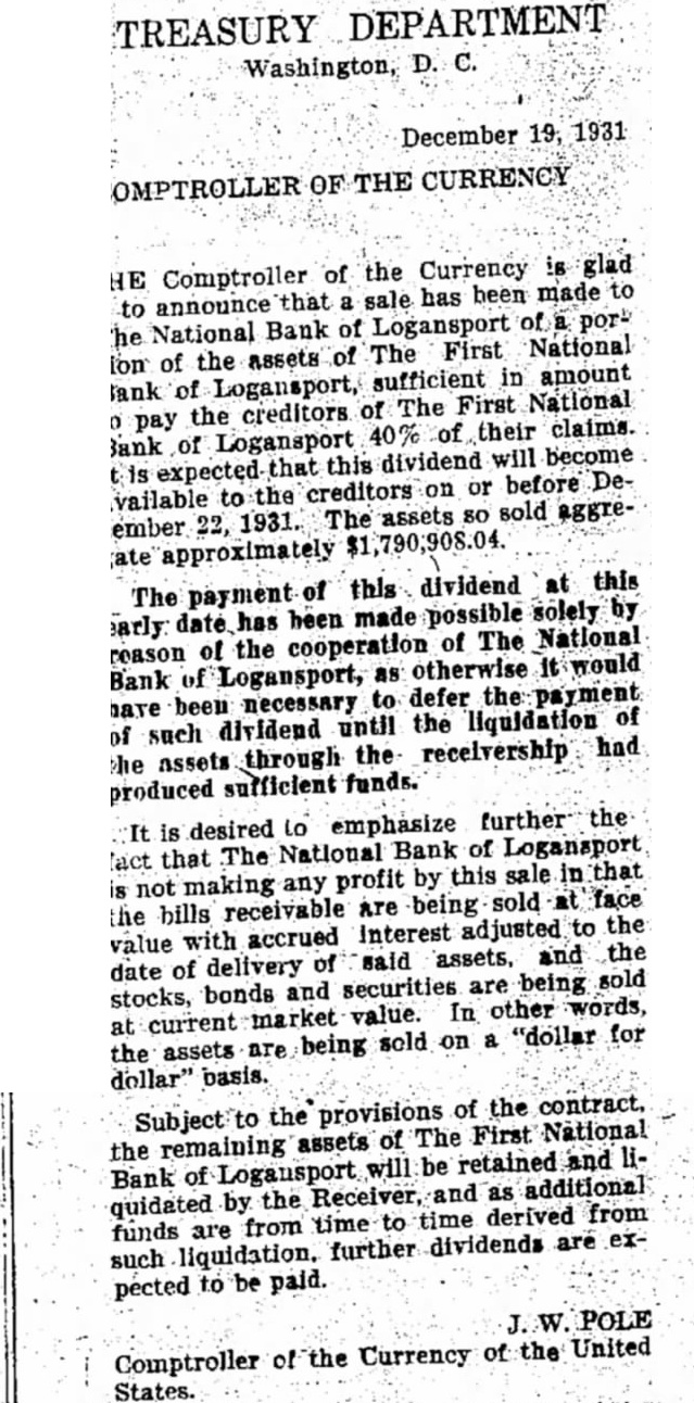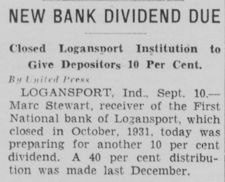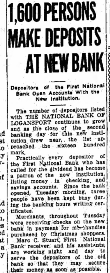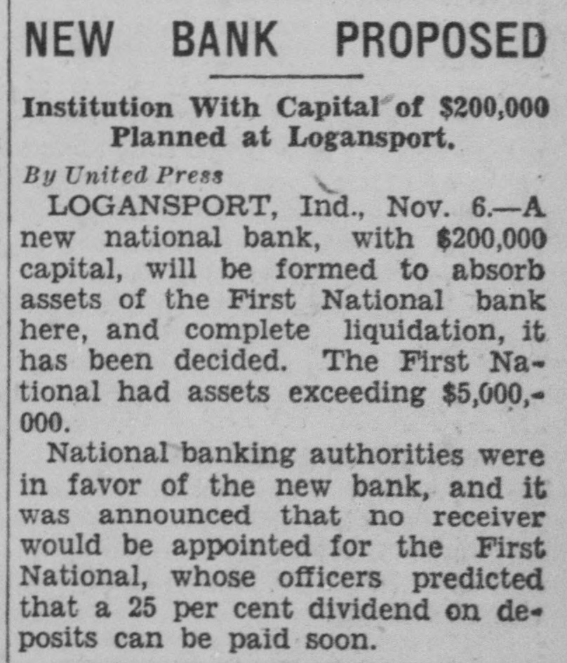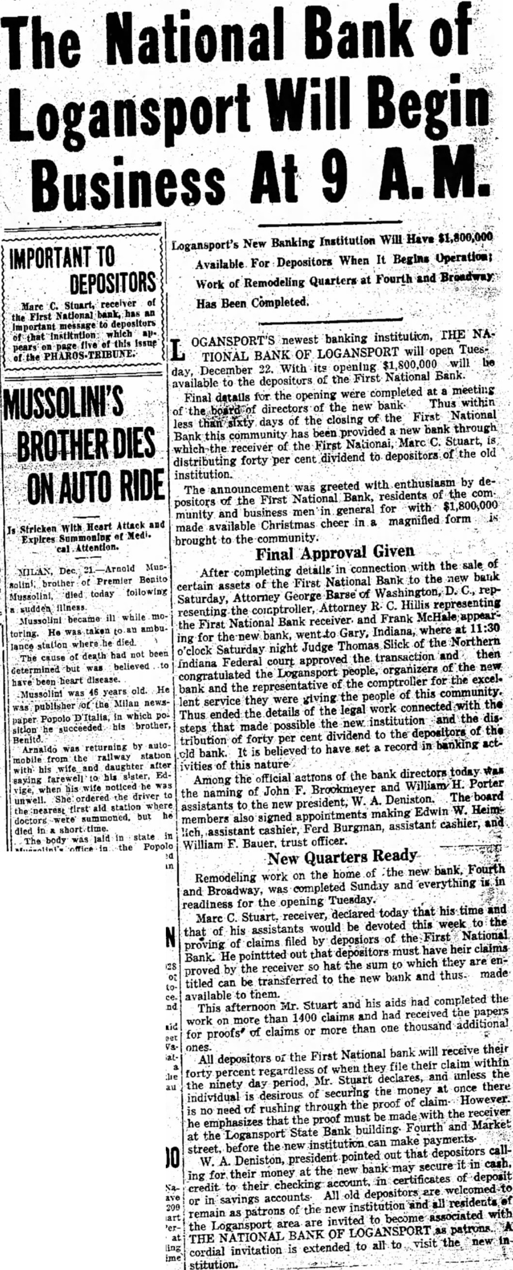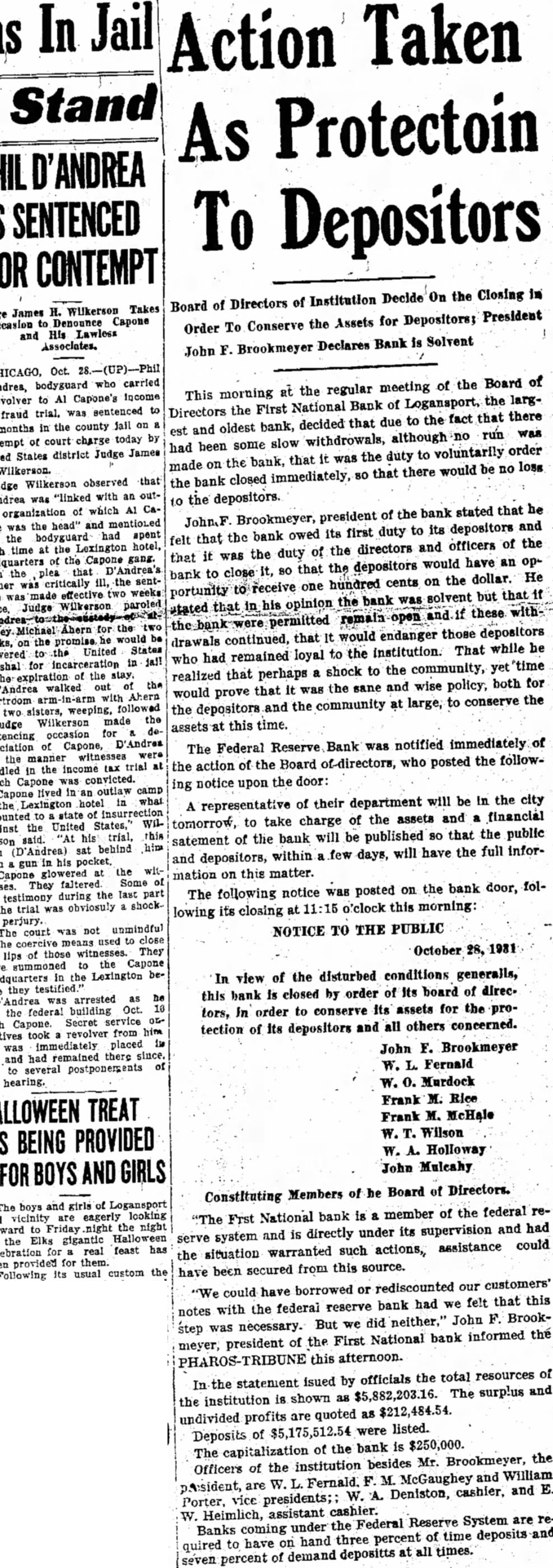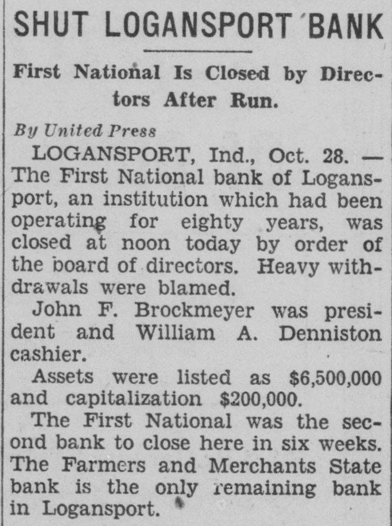 This morning at the regular meeting of the Board of Directors the First National Bank of Logansport, the largest and oldest bank, decided that due to the fact that there had been some slow withdrowals, although no run was made on the bank, that It was the duty to voluntarily order the bank closed immediately, 80 that there would be no loss 10 the depositors.