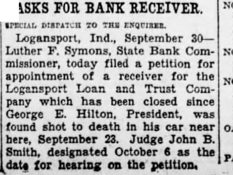 Logansport, Ind. September Luther F. State Bank missioner, today filed petition for appointment of receiver for the Logansport Loan and Trust Company which has been closed since George Hilton, President, was found shot to death in his car near here, September Judge John B. Smith, designated October 6 as the date for hearing on the petition.