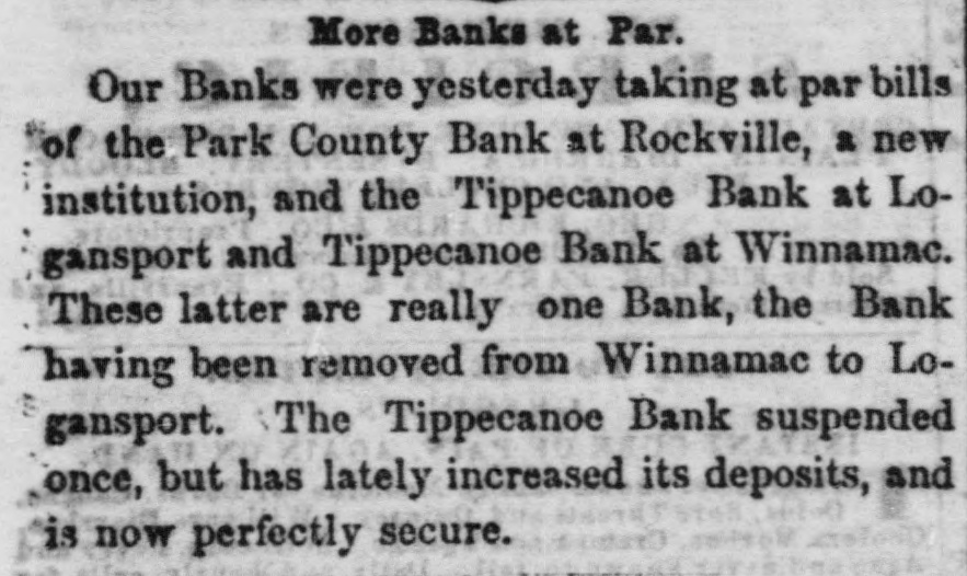 More Banks at Par. Our Banks were yesterday taking at par bills of the Park County Bank at Rockville, a new institution, and the Tippecanoe Bank at Logansport and Tippecanoe Bank at Winnamac. These latter are really one Bank, the Bank having been removed from Winnamac to Logansport. The Tippecanoe Bank suspended once, but has lately increased its deposits, and is now perfectly secure.