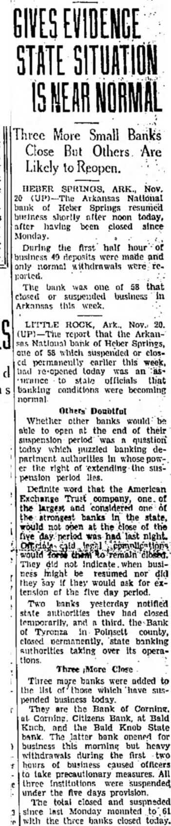 Three More Small Banks Close But Others Are Likely to Reopen. HEBER SPRINGS, ARK., Nov. Arkansas National bank of Heber Springs resumed business shortly after noon today, after having been closed since Monday. During the first half hour business deposits were made and only normal withdrawals were ported. The bank was one of 58 that closed suspended business Arkansas this week. LITTLE Ark., Nov. 20. report that the ArkanNational bank of Heber Springs, of 58 which suspended clospermanently carlier this week, today was inconce state officials that banking conditions were becoming Others' Doubtful Whether other banks would able to open the end of their suspension period question today which puzzled banking department authorities in the right of extending the suspension period Definite word that the American Exchange Trust company, one. the largest and considered the strongest banks in the state, would not open at the close the five day period was had last night. would force them closed. They did Indicate when business might resumed nor did they say they would ask for tension the five day period. Two banks yesterday notified state authorities they had closed temporarily, and third. of Tyronza in Poinsett county, closed permanently. state banking authorities taking over its operations. Three More Close Three more banks were added to the which have suspended business today. They the Bank of Corning. Corning. Citizens Bank, at Bald Knch. and the Bald Knob State bank. The latter bank opened for business this morning but heavy withdrawals during the first two hours business caused officers take precautionary measures. All three Institutions were suspended under the five days provision. The total closed and suspended since last Monday mounted to with the three banks closed today.