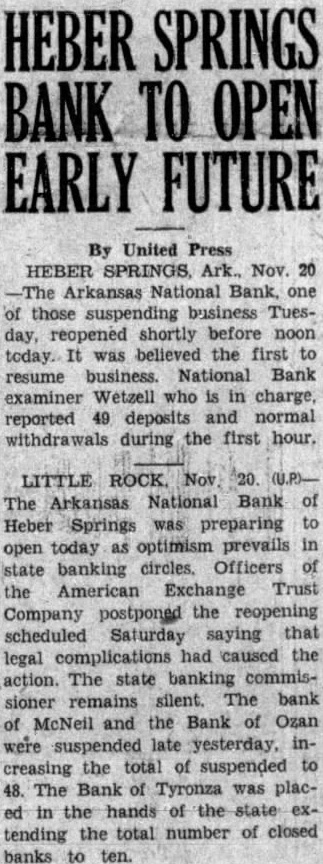 HEBER SPRINGS BANK TO OPEN EARLY FUTURE By United Press HEBER SPRINGS, Nov. 20 Arkansas National Bank, one of those suspending business Tuesday, reopened shortly before noon today. It was believed the first to resume National Bank examiner Wetzell who is in charge, reported 49 deposits and normal withdrawals during the first hour. LITTLE Nov The Arkansas National Bank of Heber Springs was preparing today as optimism prevails in open state banking circles. Officers the American Exchange Trust Company postponed the reopening scheduled Saturday saying that legal complications had caused the action. The state banking commissioner remains The bank of McNeil and the Bank of Ozan were suspended late yesterday, intotal of suspended to creasing the The Bank of Tyronza was placed in the hands of the tending the total number of closed banks to ten.