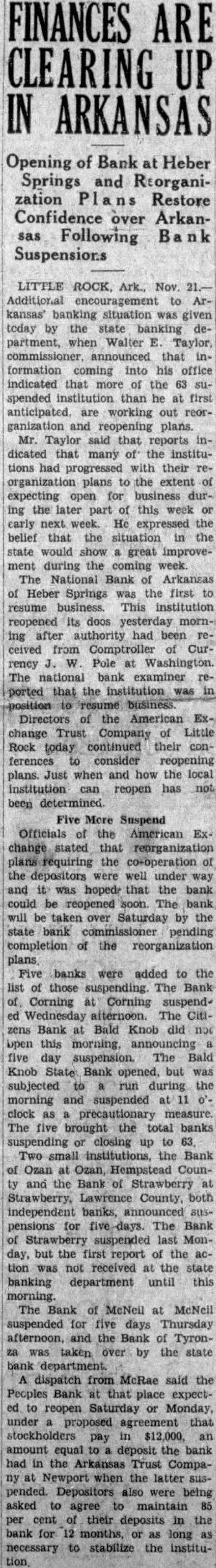FINANCES ARE CLEARING UP IN ARKANSAS Opening of Bank at Heber Springs and Reorganization Plans Restore Confidence over Arkansas Following Bank Suspensions LITTLE ROCK, Ark., Nov. Additional encouragement to Arkansas' banking situation was given today by the state banking department, when Walter E. Taylor, commissioner, announced that information coming into his office indicated that more of the 63 suspended institution than he at first anticipated. are working out reorganization and reopening plans. Mr. Taylor said that reports indicated that many of the institutions had progressed with their reorganization plans to the extent of expecting open for business during the later part of this week or carly next week. He expressed the belief that the situation in the state would show great improvement during the coming week. The National Bank of Arkansas of Heber Springs was the first to resume business. This institution reopened its doos yesterday morning after authority had been received from Comptroller of Currency W Pole at Washington. The national bank examiner reported that the institution was in position resume business Directors of the American change Trust Company of Little Rock today continued their conferences to consider reopening plans. Just when and how the local institution can reopen has been determined. Five More Suspend Officials of the American Exchange stated that reorganization requiring the co-operation of the depositors were well under way and it was hoped that the bank could be reopened soon. The bank will be taken over Saturday by the state bank commissioner pending completion of the reorganization Five banks were added to the list of those suspending. The Bank of Corning at Corning suspended Wednesday afternoon. The Citizens Bank at Bald Knob did not open this morning, five day suspension. The Bald Knob State Bank opened, but was subjected to run during the morning and suspended at 11 clock as precautionary measure. The five brought the total banks suspending or closing up to 63, Two small institutions, the Bank of Ozan at Ozan, Hempstead Counand the Bank of Strawberry Strawberry, Lawrence County, both independent banks, announced suspensions for -days. The Bank of Strawberry suspended last Monday, but the first report of the action was not received at the state banking department until this morning. The Bank of McNeil at McNeil suspended for five days Thursday afternoon, and the Bank of Tyronza was taken over by the state bank department. A dispatch from McRae said the Peoples Bank at that place expected to reopen Saturday or Monday, under a proposed agreement that stockholders pay in $12,000, an amount equal to deposit the bank had in the Arkansas Trust Company at Newport when the latter suspended. Depositors also were being asked to agree to maintain 85 per cent of their deposits in the bank for 12 months, or as long as necessary to stabilize the institu-