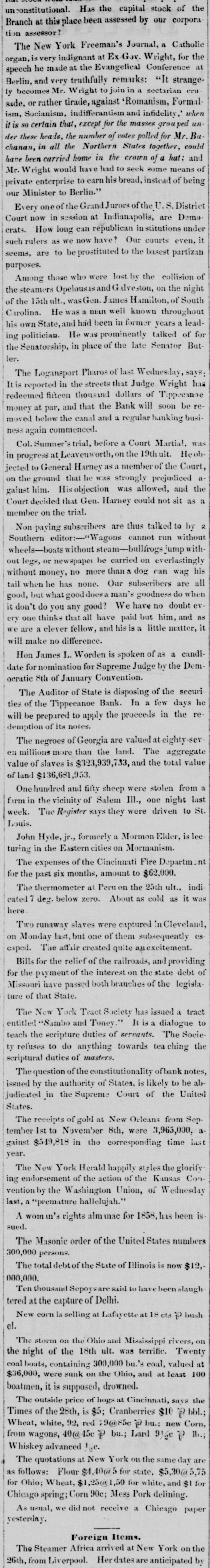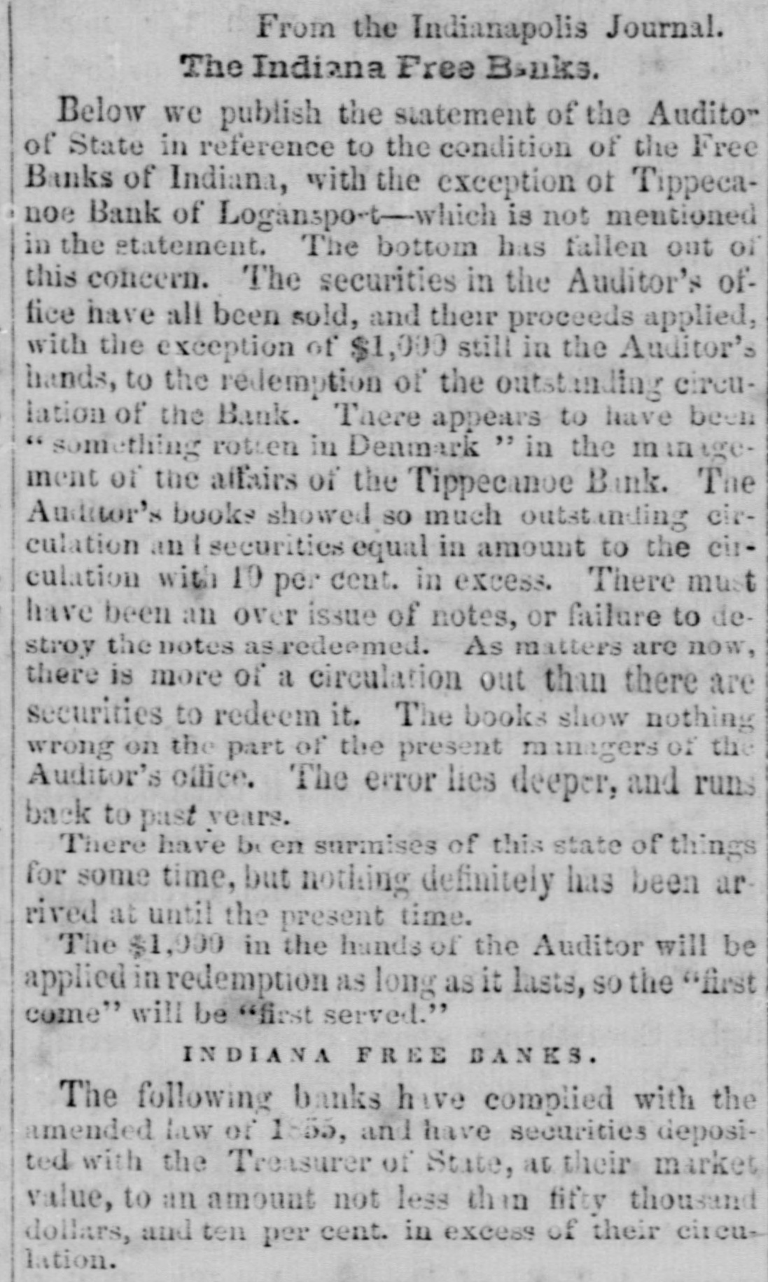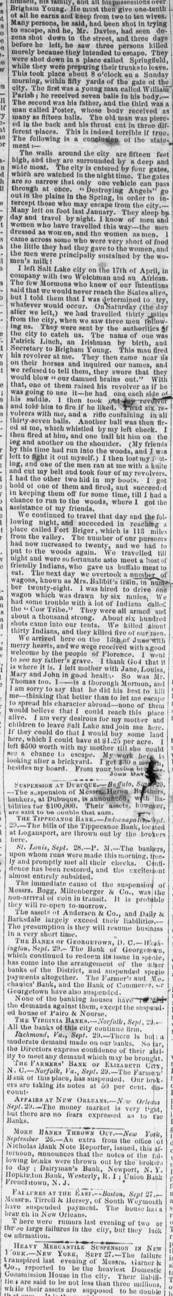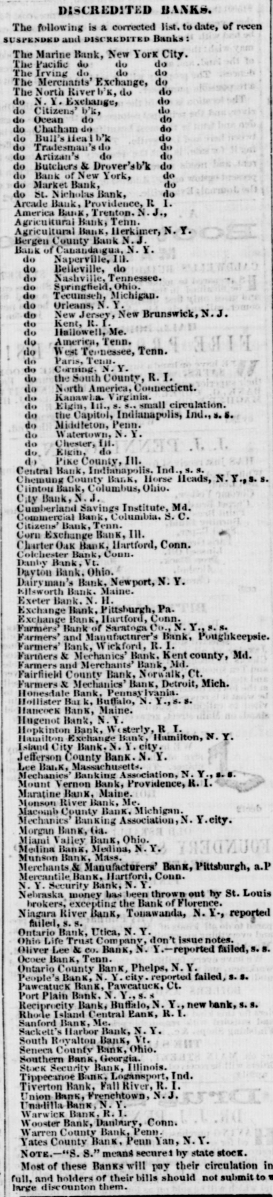 DISCREDITED BANKS. The following is a corrected list. to date, of recen SUSPENDED and DISCREDITED Banks: The Marine Bank, New York City. The Pacific do do do do do The Irving do The Merchants' Exchange, do do The North River b'k, do do do N. Y. Exchange, do do Citizens' b'k, do Ocean do do do Chatham do do do Bull's Head b'k do do Tradesman's do do do Artizan's do do do Butchers & Drover'sb'k do do do Bank of New York, do Market Bank, do do St. Nicholas Bank, do Arcade Bank, Providence, R I. America Bank, Trenton, N.J., Agricultural Bank, Tenn. Agricultural Bank, Herkimer, N. Y. Bergen County Bank N.J. Bank of Canandaigua, N. Y. do Naperville, III. do Belleville, do do Nashville, Tennessee. do Springfield, Ohio. do Tecumsch, Michigan. do Orleans, N. Y. do New Jersey, New Brunswick, N.J. do Kent, R.I. do Hallowell, Me. do America, Tenn. do West Tennessee, Tenn. do Paris, Tenn. do Corning. N.Y. do the South County, R. 1. do North America, Connecticut. do Kanawha. Virginia. do Elgin, III., S. S., small circulation. do the Capitol, Indianapolis, Ind., s. s. do Middleton, Penn. do Watertown, N.Y. do Chester, III. do Elgin, do do Pike County, III. Central Bank, Indianapolis, Ind., S. 3. Chemung County Bank, Horse Heads, N.Y.,a. s. Clinton Bank, Columbus, Ohio. City Bank, N.J. Cumberland Savings Institute, Md. Commercial Bank, Columbia. S.C. Citizens' Bank, Tenn. Corn Exchange Bank, III. Charter Oak Bank, Hartford, Conn. Colchester Bank, Conn. Danby Bank, Vt. Dayton Bank, Ohio. Dairyman's Bank, Newport, N. Y. Ellsworth Bank. Maine. Exeter Bank. N. H. Exchange Bank, Pittsburgh, Pa. Exchange Bank, Hartford, Conn. Farmers' Bank of Saratoga Co., N. Y.,s.s. Farmers' and Manufacturer's Bank, Poughkeepsie. Farmers' Bank, Wickford, R.I. Farmers & Mechanics' Bank, Kent county, Md. Farmers and Merchants' Bank, Md. Fairfield County Bank, Norwalk, Ct. Farmers & Mechanics' Bank, Detroit, Mich. Honesdale Bank, Pennsylvania. Hollister Bar k, Buffalo, N. Y., s. Hancock Bank, Maine. Hugenot Bank, N.Y. Hopkinton Bank, Westerly, R. I. Hamilton Exchange Bank, Hamilton, N. Y. Island City Bank. N. Y. city. Jefferson County Bank. N. Y. Lee Bank, Massachusetts. Mechanics' Banking Association, N. Y., S.S. Mount Vernon Bank, Providence, R. 1. Maratine Bank, Maine. Monson River Bank, Me. Macomb County Bank, Michigan. Mechanics' Banking Association, N. Y.city. Morgan Bank, Ga. Miami Valley Bank, Ohio. Medina Bank, Medina, N.Y. Munson Bank, Mass. Merchants & Manufacturers' Bank, Pittsburgh, Pa. Mercantile Bank, Hartford, Conn. N.Y. Security Bank, N. Y. Nebraska money has been thrown out by St. Louis brokers, excepting the Bank of Florence. Niagara River Bank, Tonawanda, N. Y-, reported failed, s. S. Ontario Bank, Utica, N. Y. Ohio Life Trust Company, don't issue notes. Oliver Lee & co. Bank, N. Y.-reported failed, S. s. Ocoee Bank, Tenn. Ontario County Bank, Phelps, N.Y. People's Bank, N.Y. city. reported failed, S. S. Paweatuck Bank, Pawcatuck, Ct. Port Plain Bank. N. Y., S.S. Reciprocity Bank, Buffalo, N. Y. new tank, 8. S. Rhode Island Central Bank, R.I. Sanford Bank, Me. Sackett's Harbor Bank, N. Y. South Royalton Bank, Vt. Seneca County Bank, Ohio. Southern Bank, Georgia. Stock Security Bank, Illinois. Tippecanoe Bank, Logansport, Ind. Tiverton Bank, Fall River, R.I. Union Bank, Frenchtown, N.J. Unadilla Bank, N.Y. Warwick Bank, R. I. Wooster Bank, Danbury, Conn. Warren County Bank, Penn. Yates County Bank, Penn Yan, N.Y. NOTE. S." means secured by state stock. Most of these Banks will pay their circulation in full, and holders of their bills should not submit to a large discount on them.
