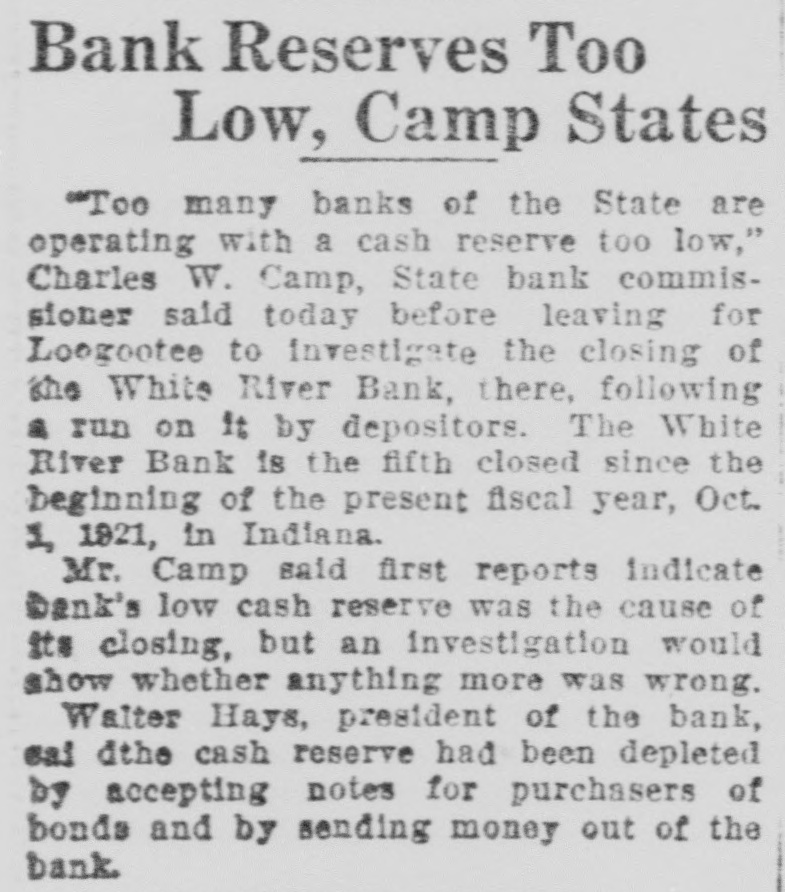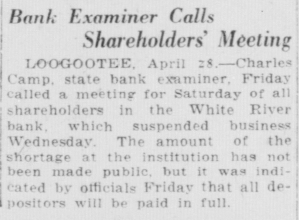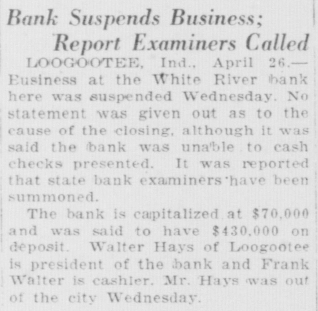 Bank Suspends Business; Report Examiners Called LOOGOOTEE, Ind., April 26.Eusiness at the White River bank here was suspended Wednesday. No statement was given out as to the cause of the closing, although it was said the bank was unable to cash checks presented. It was reported that state bank examiners *have been summoned. The bank is capitalized at $70,000 and was said to have $430,000 on deposit. Walter Hays of Loogootee is president of the bank and Frank Walter is cashier. Mr. Hays was out of the city Wednesday.