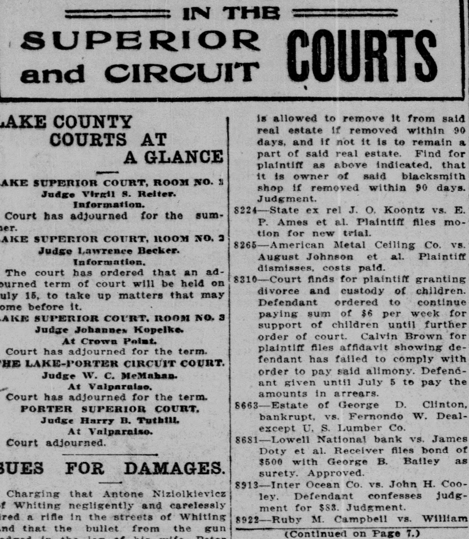 IN THE SUPERIOR COURTS and CIRCUIT is allowed to remove It from said .AKE COUNTY real estate if removed within 90 days, and if not it is to remain a COURTS AT part of said real estate. Find for A GLANCE plaintiff as above indicated, that 1 it is owner of said blacksmith SUPERIOR COURT, ROOM NO. 11 shop if removed within 90 days. Judge Virgil S. Reiter. Judgment. Information. 8224-State ex rel J. O, Koontz vs. E. Court has adjourned for the sumP. Ames et al. Plaintiff files motion for new trial. AKE SUPERIOR COURT, ROOM NO. 3 8265-American Metal Ceiling Co. vs. Judge Lawrence Becker. August Johnson et al. Plaintiff Information. dismisses, costs paid. The court has ordered that an ad8310-Court finds for plaintiff granting ourned term of court will be held on divorce and custody of children. 15, to take up matters that may Defendant ordered to continue before it. paying sum of $6 per week for AKE SUPERIOR COURT. ROOM NO. 3 support of children until further Judge Johannes Kopelke. order of court. Calvin Brown for At Crown Point. plaintiff files affidavit showing deCourt has adjourned for the term. fendant has failed to comply with HE LAKE-PORTER CIRCUIT COURT. order to pay said alimony. DefendJudge W. C. MeMahan. ant given until July 5 to pay the At Valparaise. amounts in arrears. Court has adjourned for the term. 8663-Estate of George D. Clinton, PORTER SUPERIOR COURT. bankrupt, vs. Fernondo W. DealJudge Harry B. Tutbill. except U, S. Lumber Co. At Valparaise. 8681-Lowell National bank vs. James Court adjourned. Doty et al. Receiver files bond of $500 with George B. Bailey as BUES FOR DAMAGES. surety. Approved. I 8913-Inter Ocean Co. vs. John H. CooCharging that Antone Niziolkievicz ley. Defendant confesses judgWhiting negligently and carelessly ment for $83. Judgment. a rifle in the streets of Whiting 8922-Ruby M. Campbell vs. William nd that the bullet from the gun (Continued on Page 7.) admed in thin of his wife Daten