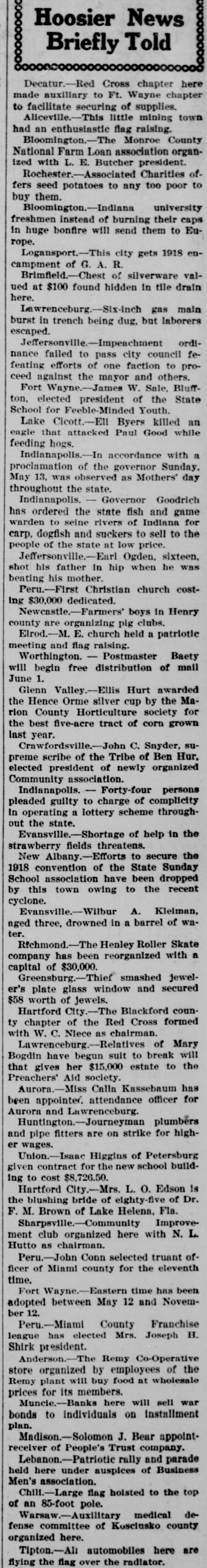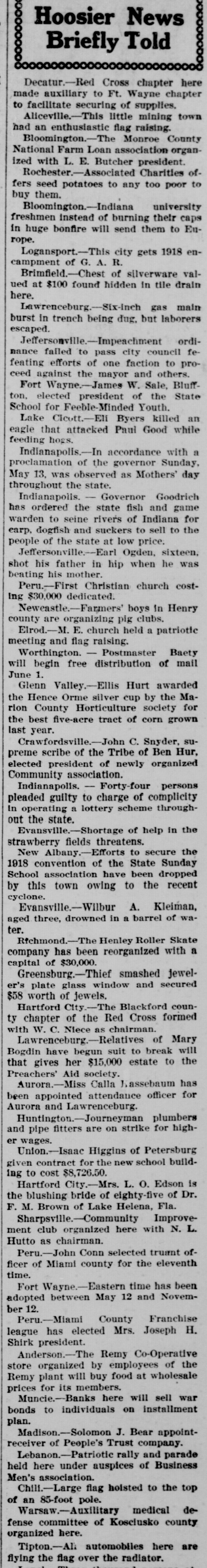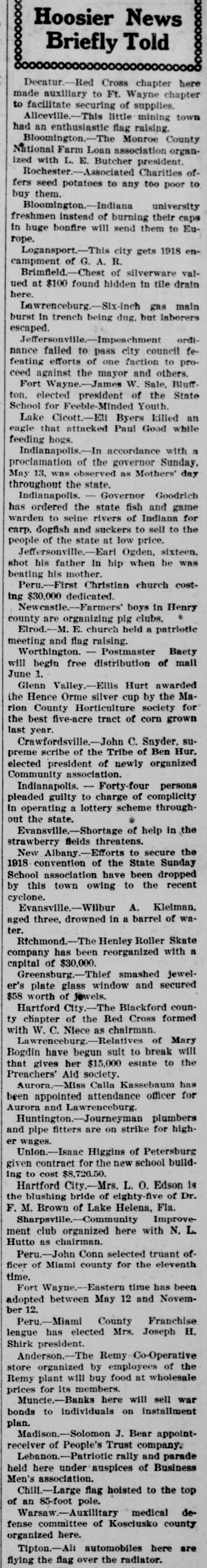 Hoosier News Briefly Told 000000000 Decatur.-Red Cross chapter here made auxiliary to Ft. Wayne chapter to facilitate securing of supplies. Aliceville.-This little mining town had an enthusiastic flag raising. Bloomington.-The Monroe County National Farm Loan association organized with L. E. Butcher president. Rochester.-Associated Charities offers seed potatoes to any too poor to buy them. Bloomington.-Indiana university freshmen instead of burning their caps in huge bonfire will send them to Europe. Logansport.-This city gets 1918 encampment of G. A. R. Brimfield.-Chest of silverware valued at $100 found hidden in tile drain here. Lawrenceburg.-Six-ineh gas main burst in trench being dug, but laborers escaped. Jeffersonville.-Impeachment ordinance failed to pass city council fefeating efforts of one faction to proceed against the mayor and others. Fort Wayne-James W. Sale, Bluffton. elected president of the State School for Feeble-Minded Youth. Lake Cicutt.-Eli Byers killed an eagle that attacked Paul Good while feeding hogs. Indianapolis.-In accordance with a proclamation of the governor Sunday, May 13, was observed as Mothers' day throughout the state. Indianapolis. - Governor Goodrich has ordered the state fish and game warden to seine rivers of Indiana for earp, dogfish and suckers to sell to the people of the state at low price. Jeffersonville.-Earl Ogden, sixteen, shot his father in hip when he was beating his mother. Peru.-First Christian church costIng $30,000 dedicated. Neweastle.-Farmers' boys In Henry county are organizing pig clubs. Elrod.-M. E. church held a patriotic meeting and flag raising. Worthington. Postmaster Baety will begin free distribution of mail June 1. Glenn Valley.-Ellis Hurt awarded the Hence Orme silver cup by the Marion County Horticulture society for the best five-acre tract of corn grown last year. Crawfordsville.-John C. Snyder, supreme scribe of the Tribe of Ben Hur, elected president of newly organized Community association. Indianapolis. - Forty-four persons pleaded guilty to charge of complicity In operating a lottery scheme throughout the state. Evansville.-Shortage of help in the strawberry fields threatens. New Albany.-Efforts to secure the 1918 convention of the State Sunday School association have been dropped by this town owing to the recent cyclone. Evansville.-Wilbur A. Kleiman, aged three, drowned in a barrel of water. Rfchmond.-The Henley Roller Skate company has been reorganized with a capital of $30,000. Greensburg.-Thief smashed jeweler's plate glass window and secured $58 worth of jewels. Hartford City-The Blackford county chapter of the Red Cross formed with W. C. Niece as chairman. Lawrenceburg.-Relatives of Mary Bogdin have begun suit to break will that gives her $15,000 estate to the Preachers' Aid society. Aurora.-Miss Calla Massebaum has been appointed attendance officer for Aurora and Lawrenceburg. Huntington.-Journeyman plumbers and pipe fitters are on strike for higher wages. Union-Isaac Higgins of Petersburg given contract for the new school building to cost $8,726.50. Hartford City.-Mrs. L. O. Edson is the blushing bride of eighty-five of Dr. F. M. Brown of Lake Helena, Fla. Sharpsville.-Community Improvement club organized here with N. L. Hutto as chairman. Peru.-John Conn selected truant officer of Miami county for the eleventh time. Fort Wayne.-Eastern time has been adopted between May 12 and November 12. Peru.-Miami County Franchise league has elected Mrs. Joseph H. Shirk president. Anderson.-The Remy Co-Operative store organized by employees of the Remy plant will buy food at wholesale prices for its members. Muncie.-Banks here will sell war bonds to individuals on installment plan. Madison.-Solomon J. Bear appointreceiver of People's Trust company. Lebanon.-Patriotic rally and parade held here under auspices of Business Men's association. Chili.-Large flag hoisted to the top of an 85-foot pole. Warsaw.-Auxilitary medical defense committee of Kosciusko county organized here. Tipton.-All automobiles here are fiving the flag over the radiator.