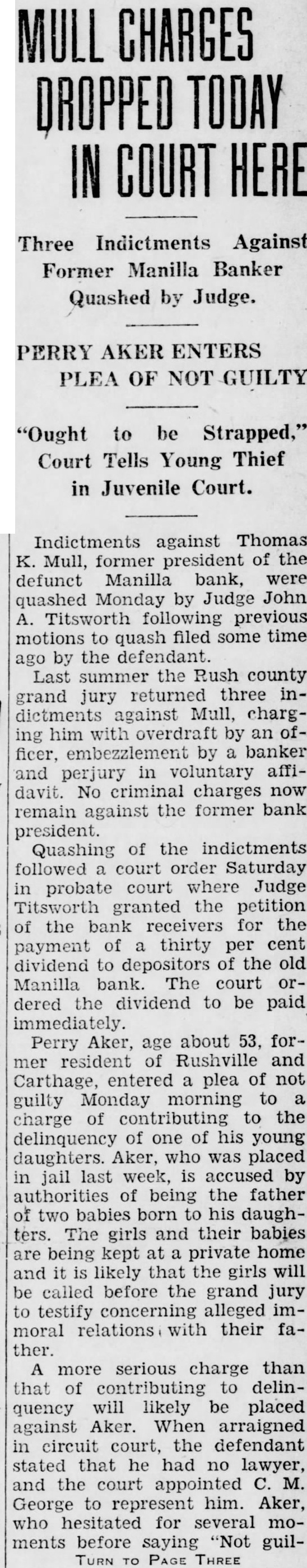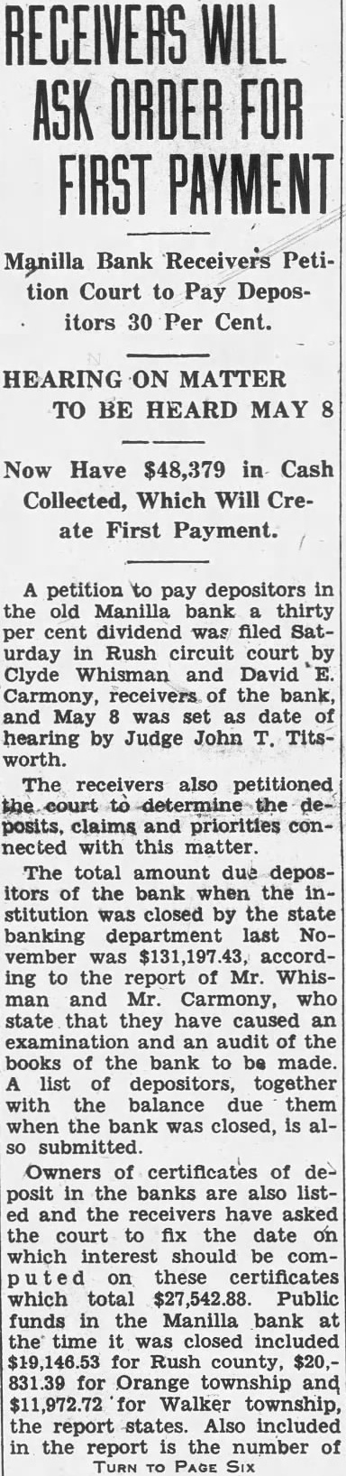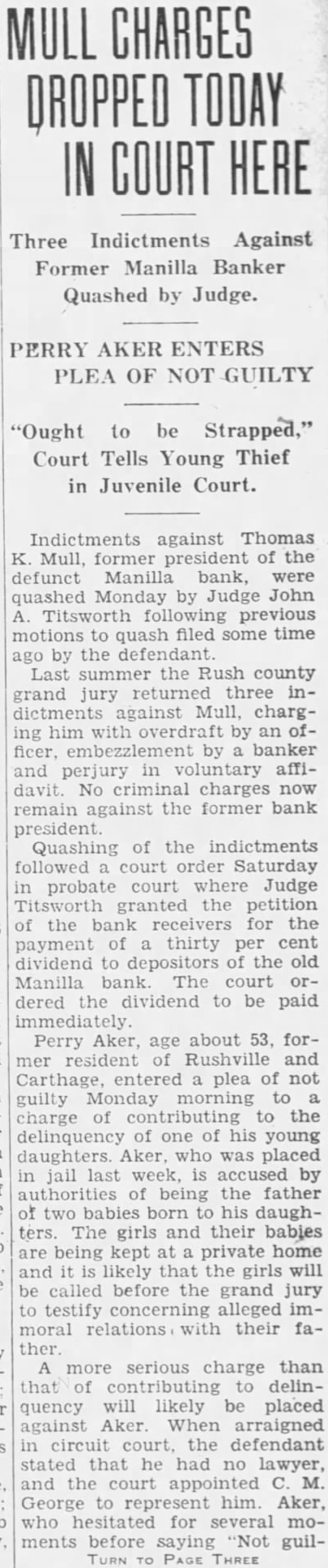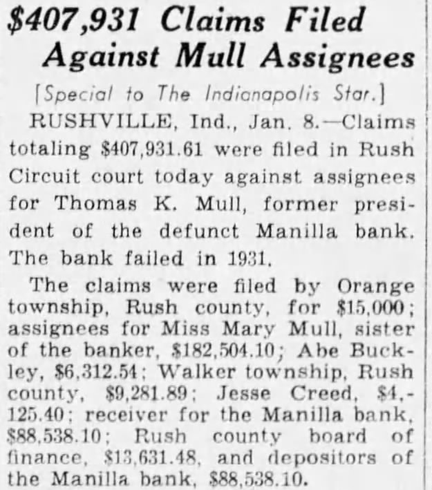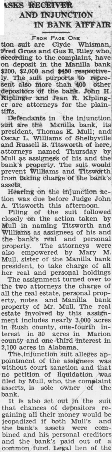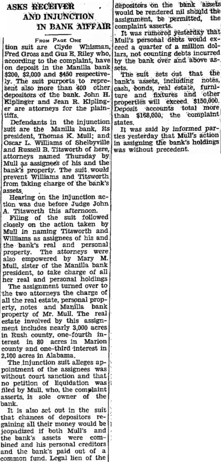 ASKS RECEIVER AND INJUNCTION IN BANK AIFFAIR FROM PAGE ONE tion suit are Clyde Whisman, Fred Gross and Gus E. Riley who, according to the complaint, have on deposit in the Manilla bank $200, $2,000 and $450 respectively. The suit purports to represent also more than 400 other depositors of the bank. John H. Kiplinger and Jean R. Kiplinger are attorneys for the plaintiffs. Defendants in the injunction suit are the Manilla bank, its president, Thomas K. Mull; and Oscar L. Williams of Shelbyville and Russell B. Titsworth of here, attorneys named Thursday by Mull as assignees of his and the bank's property. The suit would prevent Williams and Titsworth from taking charge of the bank's assets. Hearing on the injunction action was due before Judge John A. Titsworth this afternoon. Filing of the suit followed closely on the action taken by Mull in naming Titsworth and Williams as assignees of his and the bank's real and personal property. The attorneys were also empowered by Mary M. Mull, sister of the Manilla bank president, to take charge of all her real and personal holdings The assignment turned over to the two attorneys the charge of all the real estate, personal property, notes and Manilla bank property of Mr. Mull. The real estate involved by this assignment includes nearly 3,000 acres in Rush county, one-fourth interest in 80 acres in Marion county and one-third interest in 2,100 acres in Alabama. The injunction suit alleges appointment of the assignees was without court sanction and that no petition of liquidation was filed by Mull. who, the complaint asserts, is sole owner of the bank. It is also set out in the suit that chances of depositors regaining all their money would be jeopadized if both Mull's and the bank's assets were combined and his personal creditors and the bank's paid out of a common fund. Legal lien of the depositors on the bank assets would be rendered nil should the assignment, be permitted, the complaint asserts. It was rumored yesterday that Mull's personal debts would exceed a quarter of a million dollars, not counting debts incurred by the bank over and above assets. The suit sets out that the bank's assets, including notes, cash, bonds, real estate, furniture and fixtures and other properties will exceed $150,000. Deposit accounts total more than $168,000, the complaint states. It was said by informed parties yesterday that Mull's action in assigning the bank's holdings was without precedent.