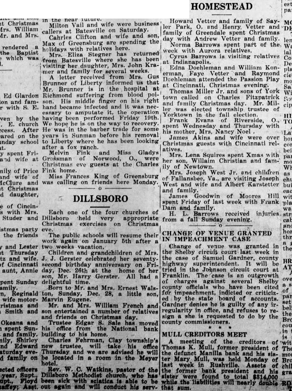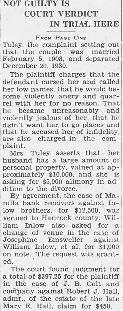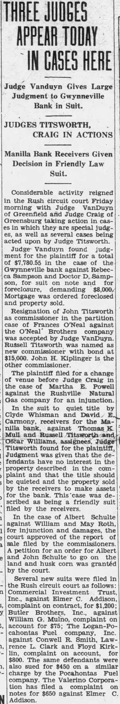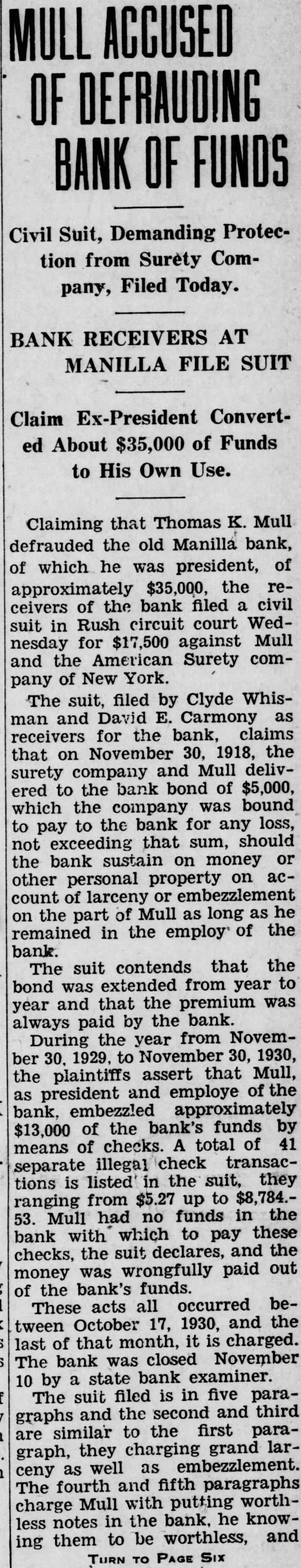 ASKS RECEIVER AND INJUNCTION IN BANK AIFFAIR FROM PAGE ONE tion suit are Clyde Whisman, Fred Gross and Gus E. Riley who, according to the complaint, have on deposit in the Manilla bank $200, $2,000 and $450 respectively. The suit purports to represent also more than 400 other depositors of the bank. John H. Kiplinger and Jean R. Kiplinger are attorneys for the plaintiffs. Defendants in the injunction suit are the Manilla bank, its president, Thomas K. Mull; and Oscar L. Williams of Shelbyville and Russell B. Titsworth of here, attorneys named Thursday by Mull as assignees of his and the bank's property. The suit would prevent Williams and Titsworth from taking charge of the bank's assets. Hearing on the injunction action was due before Judge John A. Titsworth this afternoon. Filing of the suit followed closely on the action taken by Mull in naming Titsworth and Williams as assignees of his and the bank's real and personal property. The attorneys were also empowered by Mary M. Mull, sister of the Manilla bank president, to take charge of all her real and personal holdings The assignment turned over to the two attorneys the charge of all the real estate, personal property, notes and Manilla bank property of Mr. Mull. The real estate involved by this assignment includes nearly 3,000 acres in Rush county, one-fourth interest in 80 acres in Marion county and one-third interest in 2,100 acres in Alabama. The injunction suit alleges appointment of the assignees was without court sanction and that no petition of liquidation was filed by Mull. who, the complaint asserts, is sole owner of the bank. It is also set out in the suit that chances of depositors regaining all their money would be jeopadized if both Mull's and the bank's assets were combined and his personal creditors and the bank's paid out of a common fund. Legal lien of the depositors on the bank assets would be rendered nil should the assignment, be permitted, the complaint asserts. It was rumored yesterday that Mull's personal debts would exceed a quarter of a million dollars, not counting debts incurred by the bank over and above assets. The suit sets out that the bank's assets, including notes, cash, bonds, real estate, furniture and fixtures and other properties will exceed $150,000. Deposit accounts total more than $168,000, the complaint states. It was said by informed parties yesterday that Mull's action in assigning the bank's holdings was without precedent.
