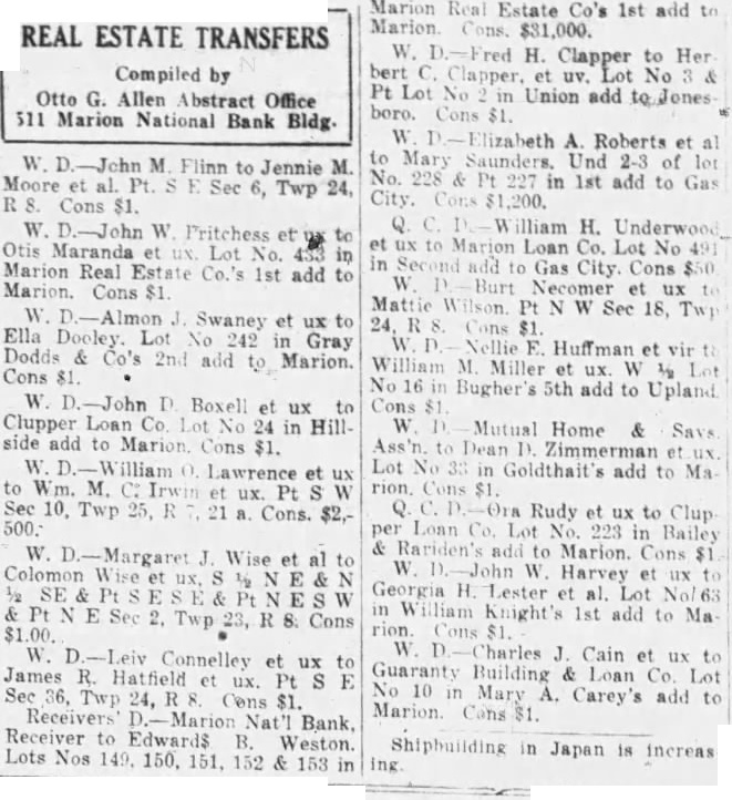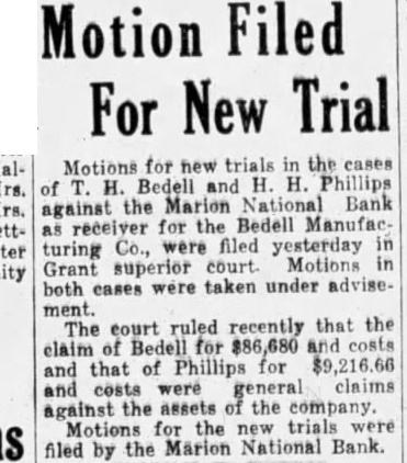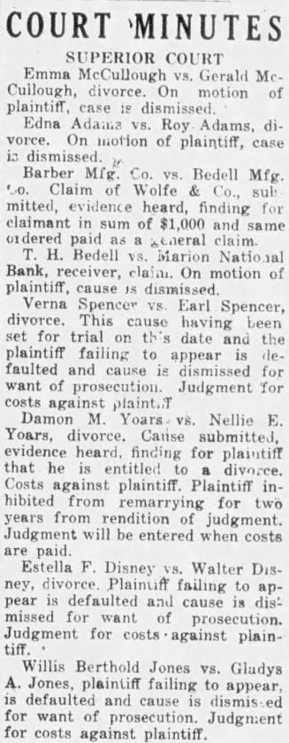 SUPERIOR COURT Emma McCullough VS. Gerald Mc. Cullough, divorce. On motion of plaintiff, case is dismissed. Edna Adams vs. Roy Adams, divorce. On motion of plaintiff, case is dismissed. Barber Mfg. Co. vs. Bedell Mfg. '.0. Claim of Wolfe & Co., sub mitted, evidence heard, finding for claimant in sum of $1,000 and same ordered paid as a general claim. T. H. Bedell vs. Marion National Bank, receiver, claim. On motion of plaintiff, cause is dismissed. Verna Spencer VS. Earl Spencer, divorce. This cause having been set for trial on this date and the plaintiff failing to appear is defaulted and cause is dismissed for want of prosecution. Judgment for costs against plaint.f Damon M. Yoars vs. Nellie E. Yoars. divorce. Cause submitted, evidence heard. finding for plaintiff that he is entitled to divorce. Costs against plaintiff. Plaintiff inhibited from remarrying for two years from rendition of judgment. Judgment will be entered when costs are paid. Estella F. Disney vs. Walter Disney, divorce Plaintiff failing to appear is defaulted and cause is dismissed for want of prosecution. Judgment for costs against plaintiff.