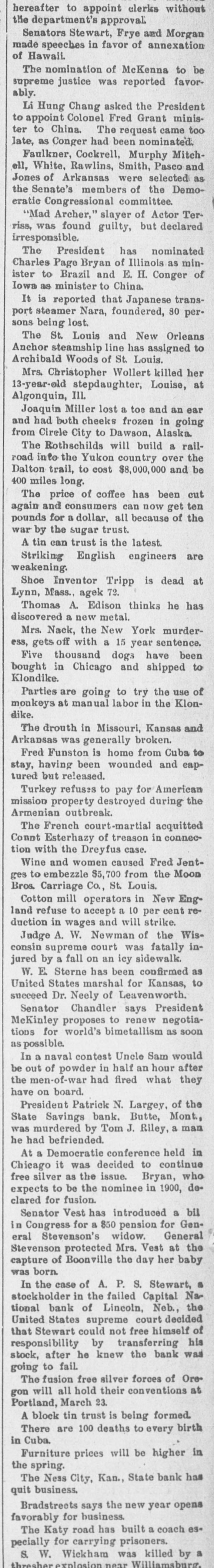 hereafter to appoint clerks without the department's approval Senators Stewart, Frye and Morgan made speeches in favor of annexation of Hawaii. The nomination of McKenna to be supreme justice was reported favorably. Li Hung Chang asked the President to appoint Colonel Fred Grant minister to China. The request came too late, as Conger had been nominated. Faulkner, Cockrell, Murphy Mitchell, White, Rawlins, Smith, Pasco and Jones of Arkansas were selected as the Senate's members of the Demoeratic Congressional committee. "Mad Archer," slayer of Actor Terriss, was found guilty, but declared irresponsible. The President has nominated Charles Page Bryan of Illinois as minister to Brazil and E. H. Conger of Iowa as minister to China. It is reported that Japanese transport steamer Nara, foundered, 80 persons being lost The St. Louis and New Orleans Anchor steamship line has assigned to Archibald Woods of St. Louis. Mrs. Christopher Wollert killed her 13-year-old stepdaughter, Louise, at Algonquin, III. Joaquin Miller lost a toe and an ear and had both cheeks frozen in going from Cirele City to Dawson, Alaska The Rothschilds will build a railroad into the Yukon country over the Dalton trail, to cost $8,000,000 and be 400 miles long. of coffee has cut and consumers can now ten again The price been get pounds for a dollar, all because of the war by the sugar trust. A tin can trust is the latest. Striking English engineers are weakening. Shoe Inventor Tripp is dead at Lynn, Mass., agek 72. Thomas A. Edison thinks he has discovered a new metal. Mrs. Nack, the New York murderess, gets off with a 15 year sentence. thousand dogs Five have shipped been to bought in Chicago and Klondike. Parties are going to try the use of monkeys at manual labor in the Klondike. The drouth in Missouri, Kansas and Arkansas was generally broken. Fred Funston is home from Cuba to stay, having been wounded and captured but released. Turkey refuses to pay for American mission property destroyed during the Armenian outbreak. The French court-martial acquitted Count Esterhazy of treason in connection with the Dreyfus case. Wine and women caused Fred Jentges to embezzle $5,700 from the Moon Bros. Carriage Co., St. Louis. Cotton mill operators in New Eng land refuse to accept a 10 reduction in wages and will strike. Judge A. W. Newman of the Wisconsin supreme court was fatally injured by a fall on an icy sidewalk. W. E Sterne has been confirmed as United States marshal for Kansas, to succeed Dr. Neely of Leavenworth. Senator Chandler says President McKinley proposes to renew negotiations for world's bimetallism as soon as possible. In a naval contest Uncle Sam would be out of powder in half an hour after the men-of-war had fired what they have on board. President Patrick N. Largey, of the State Savings bank. Butte, Mont,, was murdered by Tom J. Riley, a man he had befriended. At a Democratic conference held in Chicago it was decided to continue free silver as the issue. Bryan, who expects to be the nominee in 1900, declared for fusion. Senator Vest has introduced a bil in Congress for a $50 pension for General Stevenson's widow. General Mrs. the of Boonville the day Stevenson capture protected Vest her at baby was born. In the case of A. P. S. Stewart, a stockholder in the failed Capital Na tional bank of Lincoln, Neb., the United States supreme court decided that Stewart could not free himself of by after he knew the stock, responsibility transferring bank was his going to fail. The fusion free silver forces of Oregon will all hold their conventions at Portland, March 23. A block tin trust is being formed. There are 100 deaths to every birth in Cuba. Furniture prices will be higher in the spring. The Ness City, Kan., State bank has quit business. Bradstreets says the new year opens favorably for business. The Katy road has built a coach es. for carrying pecially prisoners. killed by S. W. Wickham was a thresher.explosion near Williamsburg.