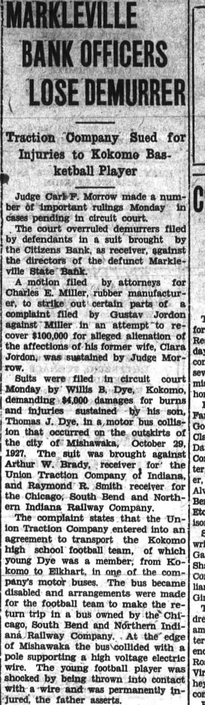 OFFICERS Traction Company Sued for Injuries to Kokome Basketball Player Judge Morrow made number important rulings Monday in periding in circuit court. The court demurrers filed defendants in suit brought by the Citizens Bank, receiver, against the directors of the defunct MarkleState Bank. motion filed by attorneys for Charles Miller, rubber manufacturto strike certain parts complaint filed by Gustav Jordon against Miller an attempt $100,000 for alleged alienation of the affections of his former wife, Clara day, Jordon, sustained by MorSuits were filed in circuit court Monday by Willis Kokomo, damages for burns and injuries sustained his son, Thomas in motor bus collision that occurred the outskirts the city October The suit was brought against Arthur Brady, receiver for the ter, Union Traction Company Indiana, and Raymond Smith receiver for the Chicago, South Bend and NorthIndiana Railway Company. The complaint that Union Company entered into an agreement to transport the Kokomo high school football team, of which young Dye was member, from Kokomo to Elkhart, in one of the company's motor buses. The bus became disabled and were made for the football team to make the return trip in bus owned by dred cago, South Bend and Northern IndiRailway Company. At edge ter of Mishawaka the with pole supporting high voltage electric wire. The young football player was shocked by being thrown into contact hey, wire and permanently the father asserts.