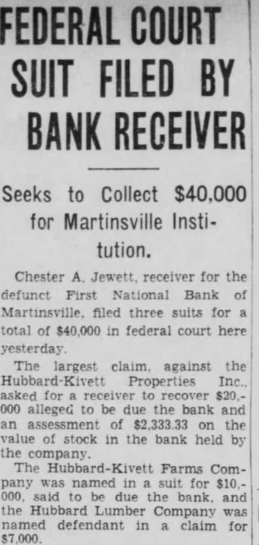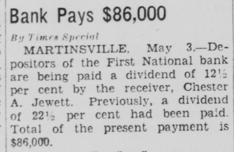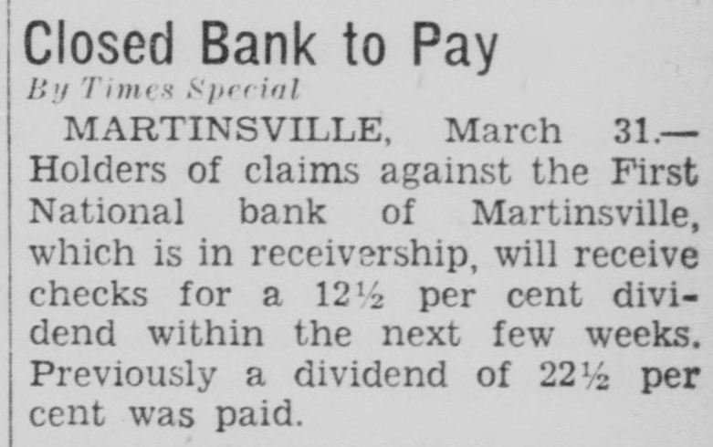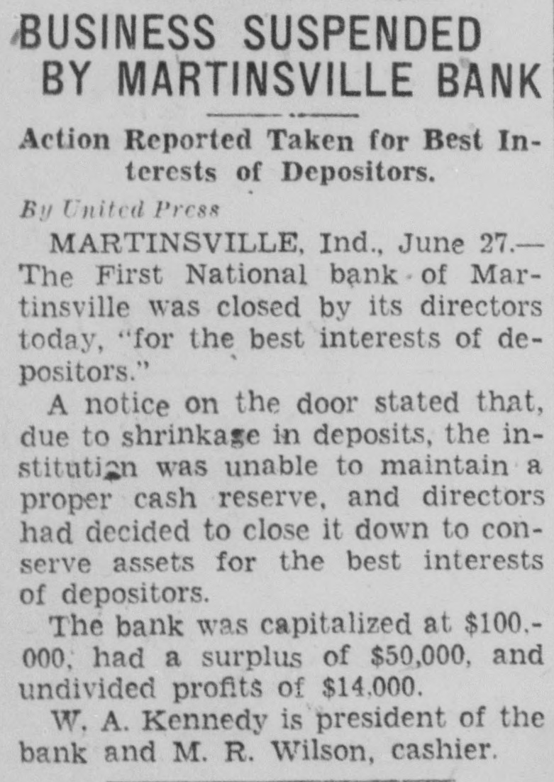 BUSINESS SUSPENDED BY MARTINSVILLE BANK Action Reported Taken for Best Interests of Depositors. By United Press MARTINSVILLE, Ind., June 27.The First National bank of Martinsville was closed by its directors today, "for the best interests of depositors." A notice on the door stated that, due to shrinkage in deposits, the institution was unable to maintain a proper cash reserve, and directors had decided to close it down to conserve assets for the best interests of depositors. The bank was capitalized at $100.000, had a surplus of $50,000, and undivided profits of $14,000. W. A. Kennedy is president of the bank and M. R. Wilson, cashier.