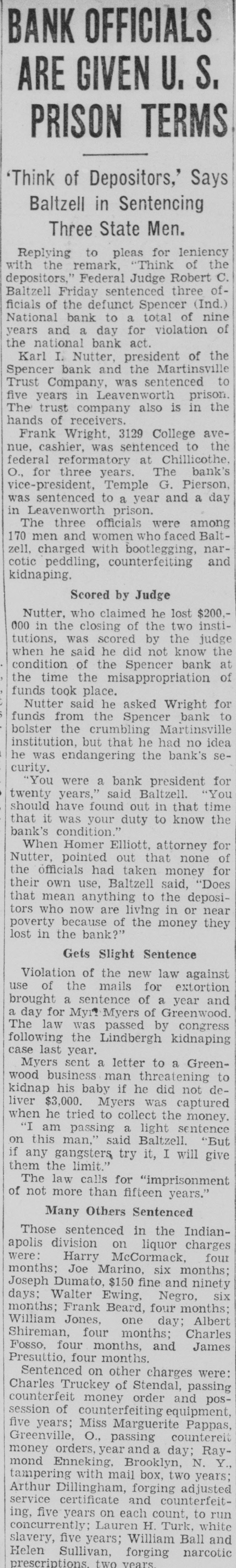BANK OFFICIALS ARE GIVEN U. S. PRISON TERMS 'Think of Depositors,' Says Baltzell in Sentencing Three State Men. Replying to pleas for leniency with the remark, "Think of the depositors," Federal Judge Robert C. Baltzell Friday sentenced three officials of the defunct Spencer (Ind.) National bank to a total of nine years and a day for violation of the national bank act. Karl I. Nutter, president of the Spencer bank and the Martinsville Trust Company, was sentenced to five years in Leavenworth prison. The trust company also is in the hands of receivers. Frank Wright, 3129 College avenue, cashier, was sentenced to the federal reformatory at Chillicothe, O., for three years. The bank's vice-president, Temple G. Pierson, was sentenced to a year and a day in Leavenworth prison. The three officials were among 170 men and women who faced Baltzell, charged with bootlegging, narcotic peddling, counterfeiting and kidnaping. Scored by Judge Nutter, who claimed he lost $200,000 in the closing of the two institutions, was scored by the judge when he said he did not know the condition of the Spencer bank at the time the misappropriation of funds took place. Nutter said he asked Wright for funds from the Spencer bank to bolster the crumbling Martinsville institution, but that he had no idea he was endangering the bank's security. "You were a bank president for twenty years," said Baltzell. "You should have found out in that time that it was your duty to know the bank's condition." When Homer Elliott, attorney for Nutter, pointed out that none of the officials had taken money for their own use, Baltzell said, "Does that mean anything to the depositors who now are living in or near poverty because of the money they lost in the bank?" Gets Slight Sentence Violation of the new law against use of the mails for extortion brought a sentence of a year and a day for Myr. Myers of Greenwood. The law was passed by congress following the Lindbergh kidnaping case last year. Myers sent a letter to a Greenwood business man threatening to kidnap his baby if he did not deliver $3,000. Myers was captured when he tried to collect the money. "I am passing a light sentence on this man," said Baltzell. "But if any gangsters try it, I will give them the limit." The law calls for "imprisonment of not more than fifteen years." Many Others Sentenced Those sentenced in the Indianapolis division on liquor charges were: Harry McCormack, four months; Joe Marino, six months; Joseph Dumato, $150 fine and ninety days; Walter Ewing, Negro, six months; Frank Beard, four months; William Jones, one day; Albert Shireman, four months; Charles Fosso, four months, and James Presuttio, four months. Sentenced on other charges were: Charles Truckey of Stendal, passing counterfeit money order and possession of counterfeiting equipment, five years; Miss Marguerite Pappas, Greenville, O., passing countereit money orders, year and a day; Raymond Enneking, Brooklyn, N. Y., tampering with mail box, two years; Arthur Dillingham, forging adjusted service certificate and counterfeiting, five years on each count, to run concurrently; Lauren H. Turk, white slavery, five years; William Ball and Helen- Sullivan forging,