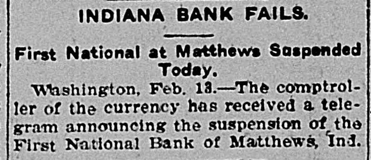 INDIANA BANK FAILS. First National at Matthews Saspended Today. Washington, Feb. 13.-The comptroller of the currency has received a telegram announcing the suspension of the First National Bank of Matthews, Ind.