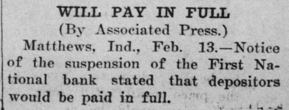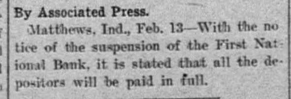 By Associated Press. Matthews, Ind., Feb. 13-With the no tice of the suspension of the First National Bank, it is stated that all the depositors will be paid in full.