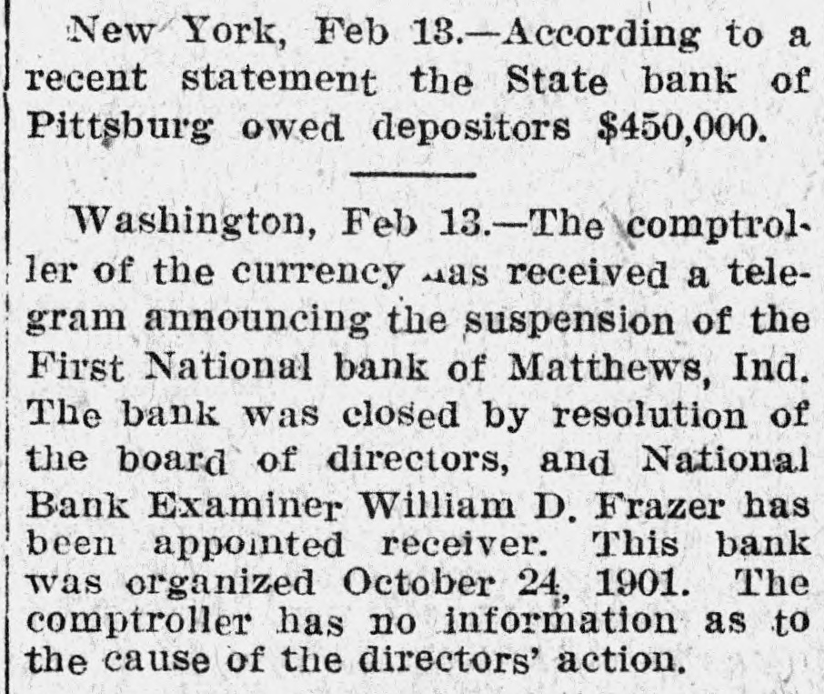 New York, Feb 13.-According to a recent statement the State bank of Pittsburg owed depositors $450,000. Washington, Feb 13.-The comptroller of the currency as received a telegram announcing the suspension of the First National bank of Matthews, Ind. The bank was closed by resolution of the board of directors, and National Bank Examiner William D. Frazer has been appointed receiver. This bank was organized October 24, 1901. The comptroller has no information as to the cause of the directors' action.
