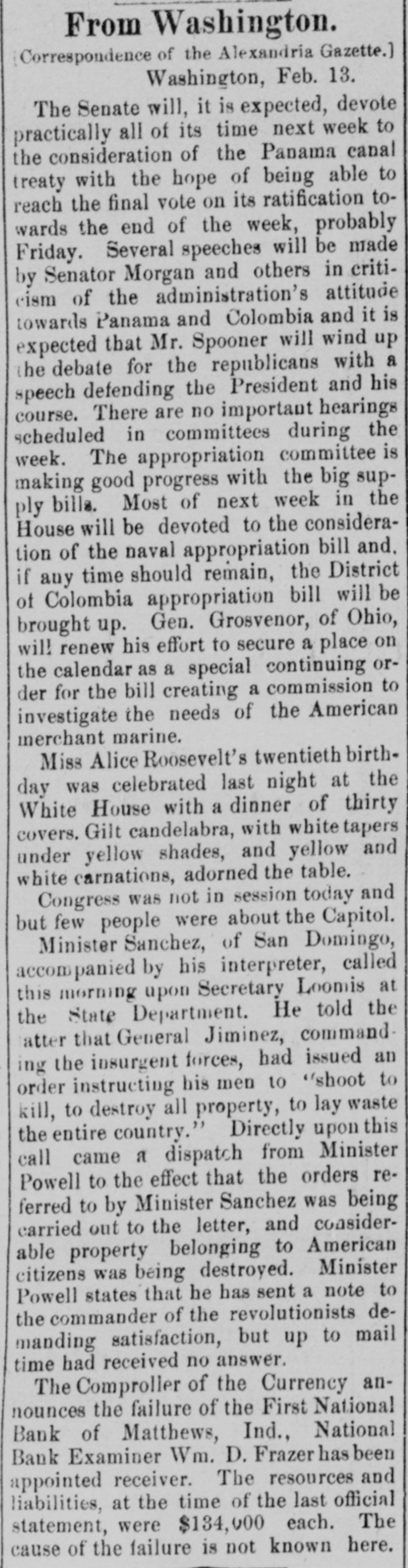 From Washington. (Correspondence of the Alexandria Gazette.] Washington, Feb. 13. The Senate will, it is expected, devote practically all of its time next week to the consideration of the Panama canal treaty with the hope of being able to reach the final vote on its ratification towards the end of the week, probably Friday. Several speeches will be made by Senator Morgan and others in criticism of the administration's attitude towards Panama and Colombia and it is expected that Mr. Spooner will wind up the debate for the republicans with a speech defending the President and his course. There are no important hearings scheduled in committees during the week. The appropriation committee is making good progress with the big supply bills. Most of next week in the House will be devoted to the consideration of the naval appropriation bill and, if any time should remain, the District of Colombia appropriation bill will be brought up. Gen. Grosvenor, of Ohio, will renew his effort to secure a place on the calendar as a special continuing order for the bill creating a commission to investigate the needs of the American merchant marine. Miss Alice Roosevelt's twentieth birthday was celebrated last night at the White House with a dinner of thirty covers. Gilt candelabra, with white tapers under yellow shades, and yellow and white carnations, adorned the table. Congress was not in session today and but few people were about the Capitol. Minister Sanchez, of San Domingo, accompanied by his interpreter, called this morning upon Secretary Loomis at the State Department. He told the atter that General Jiminez, command. ing the insurgent forces, had issued an order instructing his men to "shoot to kill, to destroy all property, to lay waste the entire country." Directly upon this call came я dispatch from Minister Powell to the effect that the orders referred to by Minister Sanchez was being carried out to the letter, and considerable property belonging to American citizens was being destroyed. Minister Powell states that he has sent a note to the commander of the revolutionists demanding satisfaction, but up to mail time had received no answer. The Comproller of the Currency announces the failure of the First National Bank of Matthews, Ind., National Bank Examiner Wm. D. Frazer has been appointed receiver. The resources and liabilities, at the time of the last official statement, were $134,000 each. The cause of the failure is not known here.