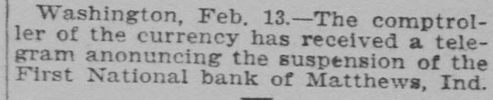 Washington, Feb. 13.-The comptroller of the currency has received a telegram anonuncing the suspension of the First National bank of Matthews, Ind.