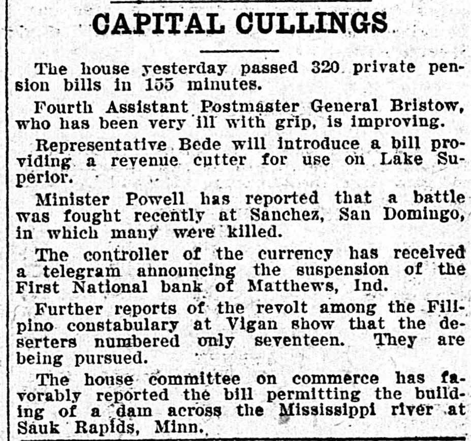 CAPITAL CULLINGS The house yesterday passed 320 private pension bills in 155 minutes. Fourth Assistant Postmaster General Bristow, who has been very ill with grip, is improving. Representative Bede will introduce a bill providing a revenue cutter for use on Lake Superior. Minister Powell has reported that a battle was fought recently at Sanchez, San Domingo, in which many were killed. The controller of the currency has received a telegram announcing the suspension of the First National bank of Matthews, Ind. Further reports of the revolt among the Fillpino constabulary at Vigan show that the deserters numbered only seventeen. They are being pursued. The house committee on commerce has favorably reported the bill permitting the building of a dam across the Mississippi river at Sauk Rapids, Minn.