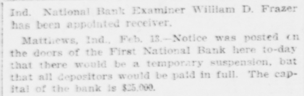 Ind. National Bank Examiner William D. Frazer has been appointed receiver. Matthews, Ind., Feb. 13.-Notice was posted on the doors of the First National Bank here to-day that there would be a temporary suspension, but that all depositors would be paid in full. The capital of the bank is $25,000.